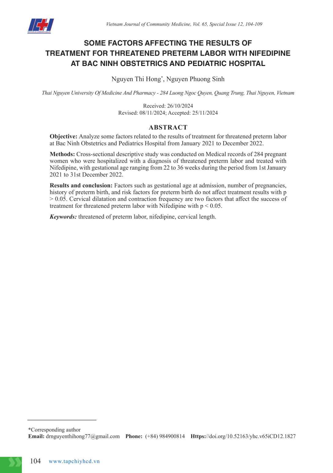 Phân tích một số yếu tố liên quan đến kết quả điều trị dọa đẻ non tại Bệnh viện Sản Nhi Bắc Ninh từ tháng 1 năm 2021 đến tháng 12 năm 2022. Đối tượng và phương pháp: Nghiên cứu mô tả cắt ngang trên bệnh án của 284 thai phụ đã nhập viện với chẩn đoán dọa đẻ non và được điều trị bằng Nifedipine, có tuổi thai từ 22 đến 36 tuần trong thời gian từ 01/01/2021 đến 31/12/2022. Kết quả và Kết luận: Các yếu tố tuổi thai khi nhập viện, số lần mang thai, tiền sử đẻ non, yếu tố nguy cơ đẻ non không ảnh hưởng tới kết quả điều trị với p > 0,05. Độ mở cổ tử cung và tần số cơn co là hai yếu tố ảnh hưởng tới khả năng thành công của điều trị dọa đẻ non bằng Nifedipine với p < 0,05.