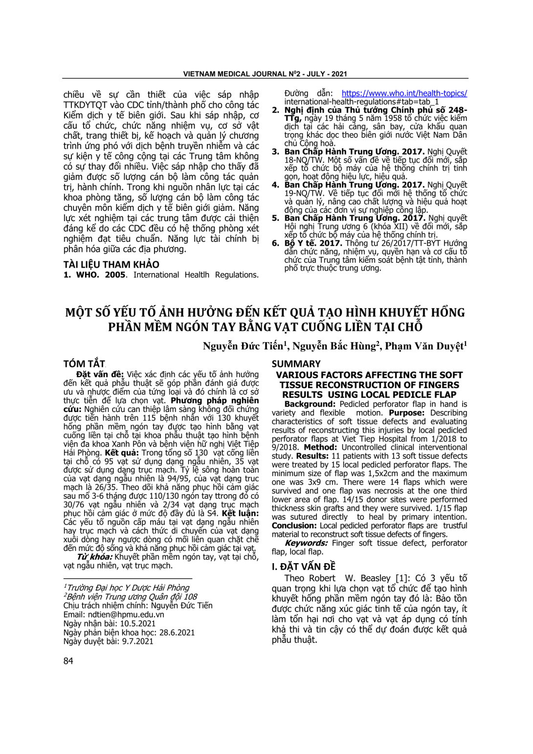 Việc xác định các yếu tố ảnh hưởng đến kết quả phẫu thuật sẽ góp phần đánh giá được ưu và nhược điểm của tứng loại và đó chính là cơ sở thực tiễn để lựa chọn vạt. Phương pháp nghiên cứu: Nghiên cứu can thiệp lâm sàng không đối chứng được tiến hành trên 115 bệnh nhân với 130 khuyết hổng phần mềm ngón tay được tạo hình bằng vạt cuống liền tại chỗ tại khoa phẫu thuật tạo hình bệnh viện đa khoa Xanh Pôn và bệnh viện hữ nghị Việt Tiệp Hải Phòng. Kết quả: Trong tổng số 130 vạt cống liền tại chỗ có 95 vạt sử dụng dạng ngẫu nhiên, 35 vạt được sử dụng dạng trục mạch. Tỷ lệ sông hoàn toàn của vạt dạng ngẫu nhiên là 94/95, của vạt dạng truc mạch là 26/35. Theo dõi khả năng phục hồi cảm giác sau mổ 3-6 tháng được 110/130 ngón tay ttrong đó có 30/76 vạt ngẫu nhiên và 2/34 vạt dạng trục mạch phục hồi cảm giác ở mức độ đầy đủ là S4. Kết luận: Các yếu tố nguồn cấp máu tại vạt dạng ngẫu nhiên hay trục mạch và cách thức di chuyển của vạt dạng xuôi dòng hay ngược dòng có mối liên quan chặt chẽ đến mức độ sống và khả năng phục hồi cảm giác tại vạt