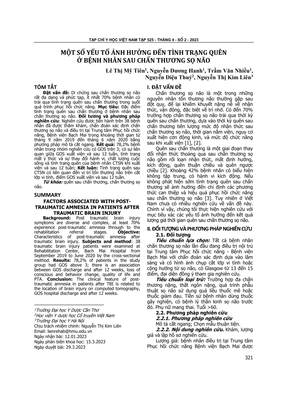 Di chứng sau chấn thương sọ não rất đa dạng và phức tạp, ít nhất 70% bệnh nhân có trải qua tình trạng quên sau chấn thương trong suốt quá trình phục hồi chức năng. Mục tiêu: Đặc điểm tình trạng quên sau chấn thương ở bệnh nhân sau chấn thương sọ não. Đối tương và phương pháp nghiên cứu: Nghiên cứu được tiến hành trên 38 bệnh nhân đã được thăm khám, chẩn đoán xác định chấn thương sọ não và điều trị tại Trung tâm Phục hồi chức năng, Bệnh viện Bạch Mai trong khoảng thời gian từ tháng 9 năm 2019 đến tháng 6 năm 2020 bằng phương pháp mô tả cắt ngang. Kết quả: 78,2% bệnh nhân trong nhóm nghiên cứu có GOS trên 3; có sự liên quan giữa GOS xuất viện và sau 12 tuần, tình trạng mất ý thức và sự thay đổi hành vi, chất lượng cuộc sống và tình trạng quên của bệnh nhân CTSN khi xuất viện và sau 12 tuần; Kết luận: Tình trạng quên sau CTSN có liên quan đến vị trí tổn thương não trên cắt lớp vi tính, điểm GOS xuất viện và sau 12 tuần.