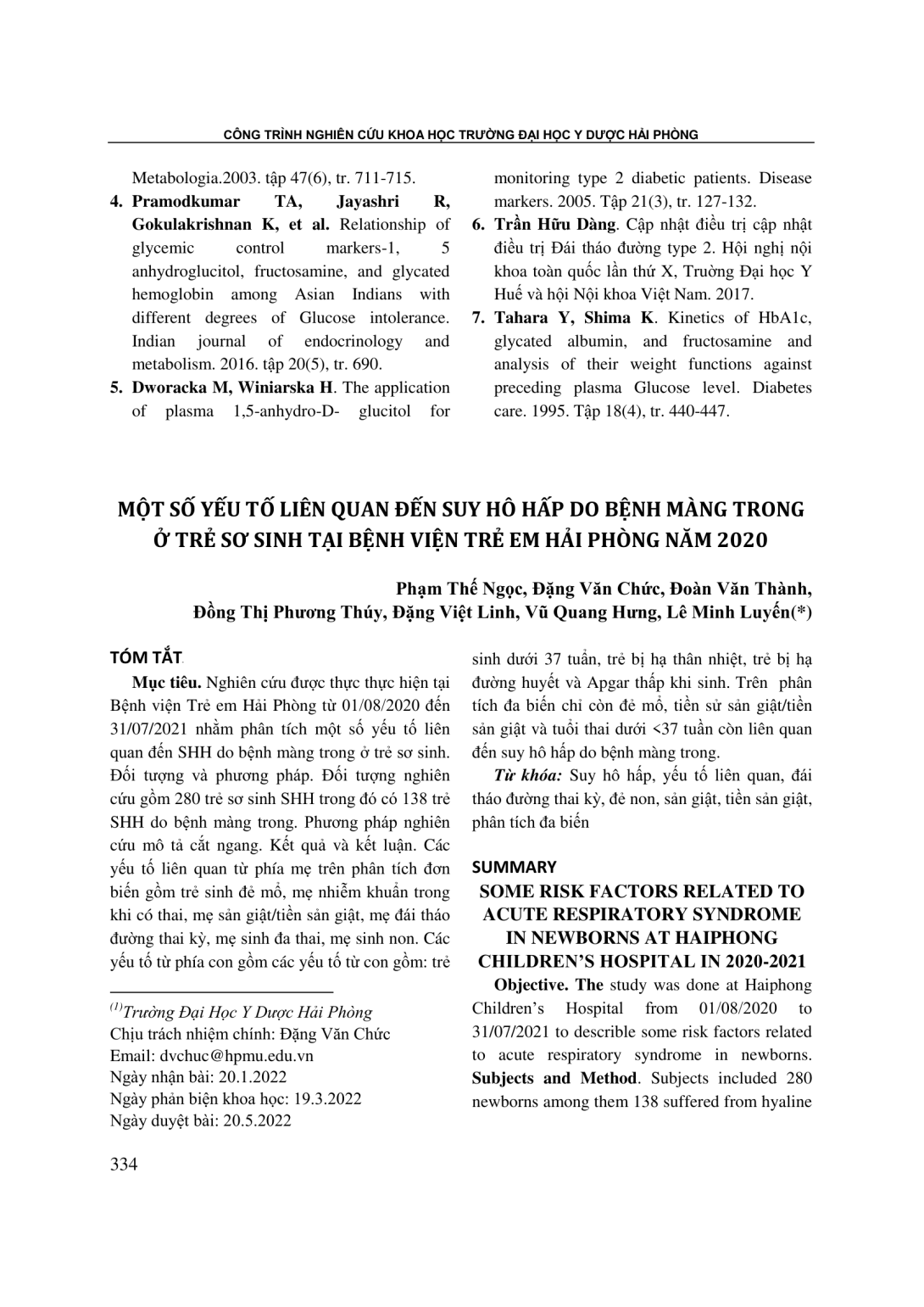 Nghiên cứu được thực thực hiện tại Bệnh viện Trẻ em Hải Phòng từ 01/08/2020 đến 31/07/2021 nhằm phân tích một số yếu tố liên quan đến SHH do bệnh màng trong ở trẻ sơ sinh. Đối tượng và phương pháp. Đối tượng nghiên cứu gồm 280 trẻ sơ sinh SHH trong đó có 138 trẻ SHH do bệnh màng trong. Phương pháp nghiên cứu mô tả cắt ngang. Kết quả và kết luận. Các yếu tố liên quan từ phía mẹ trên phân tích đơn biến gồm trẻ sinh đẻ mổ, mẹ nhiễm khuẩn trong khi có thai, mẹ sản giật/tiền sản giật, mẹ đái tháo đường thai kỳ, mẹ sinh đa thai, mẹ sinh non. Các yếu tố từ phía con gồm các yếu tố từ con gồm: trẻ sinh dưới 37 tuẩn, trẻ bị hạ thân nhiệt, trẻ bị hạ đường huyết và Apgar thấp khi sinh. Trên phân tích đa biến chỉ còn đẻ mổ, tiền sử sản giật/tiền sản giật và tuổi thai dưới <37 tuần còn liên quan đến suy hô hấp do bệnh màng trong.