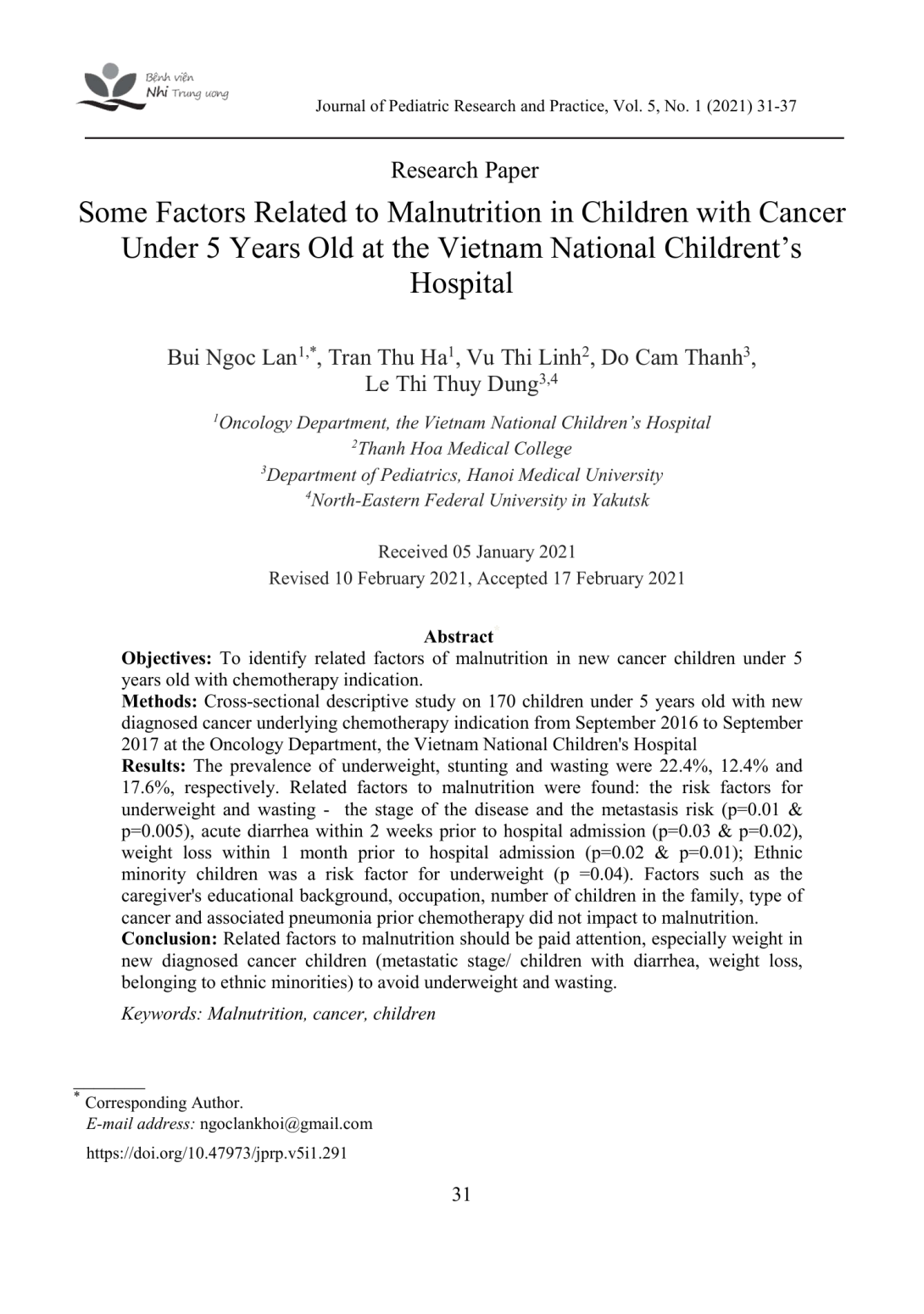 To identify related factors of malnutrition in new cancer children under 5 years old with chemotherapy indication. Methods Cross-sectional descriptive study on 170 children under 5 years old with new diagnosed cancer underlying chemotherapy indication from September 2016 to September 2017 at the Oncology Department, the Vietnam National Children's Hospital Results The prevalence of underweight, stunting and wasting were 22.4%, 12.4% and 17.6%, respectively. Related factors to malnutrition were found the risk factors for underweight and wasting - the stage of the disease and the metastasis risk (p=0.01 & p=0.005), acute diarrhea within 2 weeks prior to hospital admission (p=0.03 & p=0.02), weight loss within 1 month prior to hospital admission (p=0.02 & p=0.01); Ethnic minority children was a risk factor for underweight (p =0.04). Factors such as the caregiver's educational background, occupation, number of children in the family, type of cancer and associated pneumonia prior chemotherapy did not impact to malnutrition. Conclusion Related factors to malnutrition should be paid attention, especially weight in new diagnosed cancer children (metastatic stage/ children with diarrhea, weight loss, belonging to ethnic minorities) to avoid underweight and wasting.