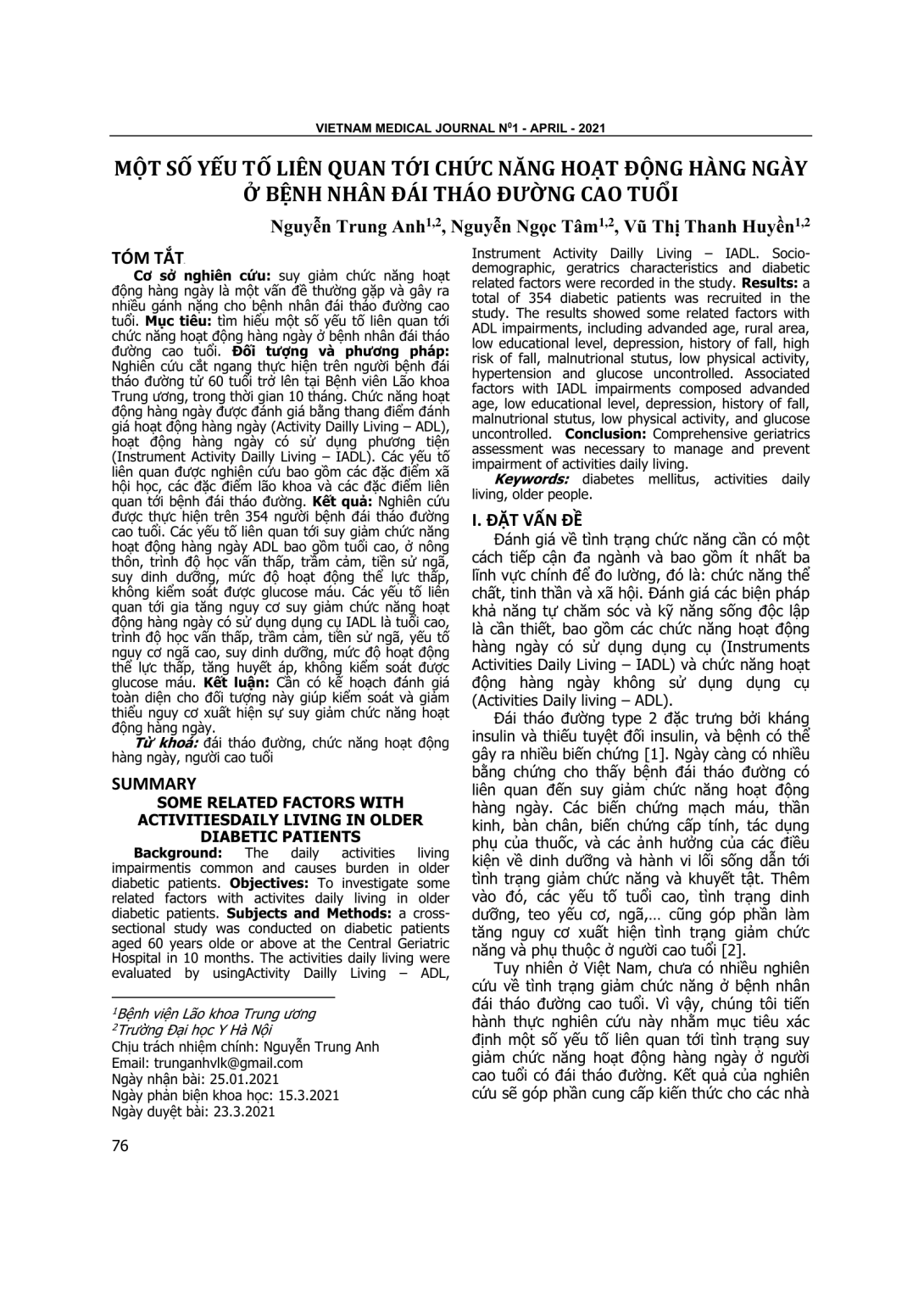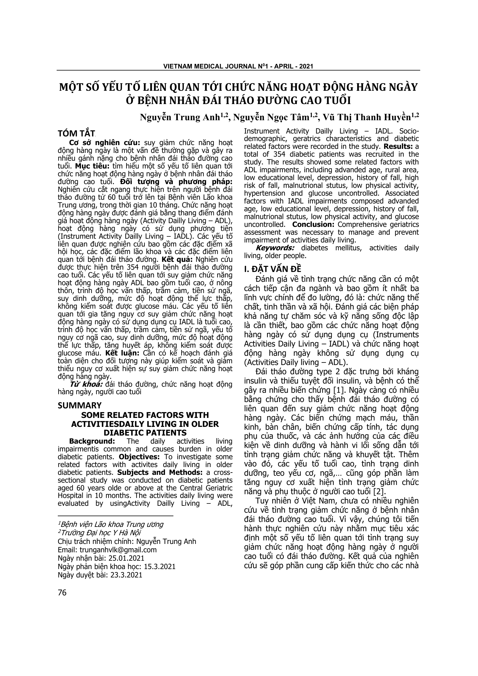 Tìm hiểu một số yếu tố liên quan tới chức năng hoạt động hàng ngày ở bệnh nhân đái tháo đường cao tuổi. Đối tượng và phương pháp: Nghiên cứu cắt ngang thực hiện trên người bệnh đái tháo đường tử 60 tuổi trở lên tại Bệnh viên Lão khoa Trung ương, trong thời gian 10 tháng. Chức năng hoạt động hàng ngày được đánh giá bằng thang điểm đánh giá hoạt động hàng ngày (Activity Dailly Living – ADL), hoạt động hàng ngày có sử dụng phương tiện (Instrument Activity Dailly Living – IADL). Các yếu tố liên quan được nghiên cứu bao gồm các đặc điểm xã hội học, các đặc điểm lão khoa và các đặc điểm liên quan tới bệnh đái tháo đường. Kết quả: Nghiên cứu được thực hiện trên 354 người bệnh đái tháo đường cao tuổi. Các yếu tố liên quan tới suy giảm chức năng hoạt động hàng ngày ADL bao gồm tuổi cao, ở nông thôn, trình độ học vấn thấp, trầm cảm, tiền sử ngã, suy dinh dưỡng, mức độ hoạt động thể lực thấp, không kiểm soát được glucose máu. Các yếu tố liên quan tới gia tăng nguy cơ suy giảm chức năng hoạt động hàng ngày có sử dụng dụng cụ IADL là tuổi cao, trình độ học vấn thấp, trầm cảm, tiền sử ngã, yếu tố nguy cơ ngã cao, suy dinh dưỡng, mức độ hoạt động thể lực thấp, tăng huyết áp, không kiểm soát được glucose máu. Kết luận: Cần có kế hoạch đánh giá toàn diện cho đối tượng này giúp kiểm soát và giảm thiểu nguy cơ xuất hiện sự suy giảm chức năng hoạt động hàng ngày.