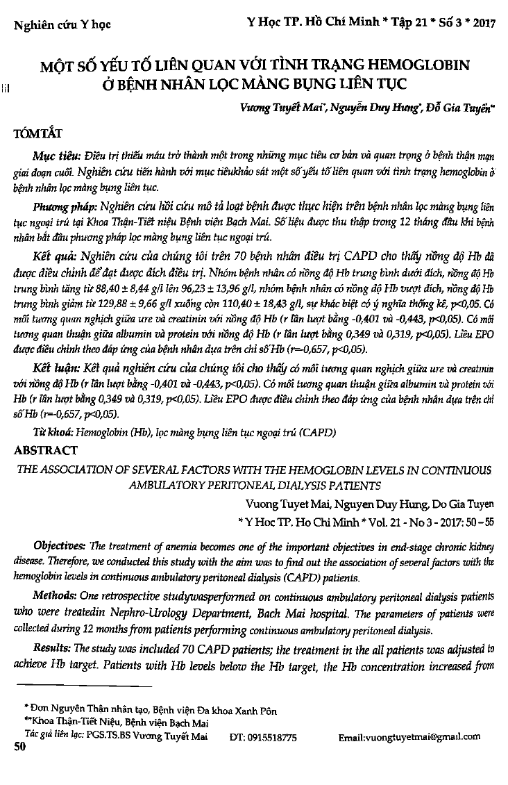 Một số yếu tố liên quan với tình trạng hemoglobin ở bệnh nhân lọc màng bụng liên tục