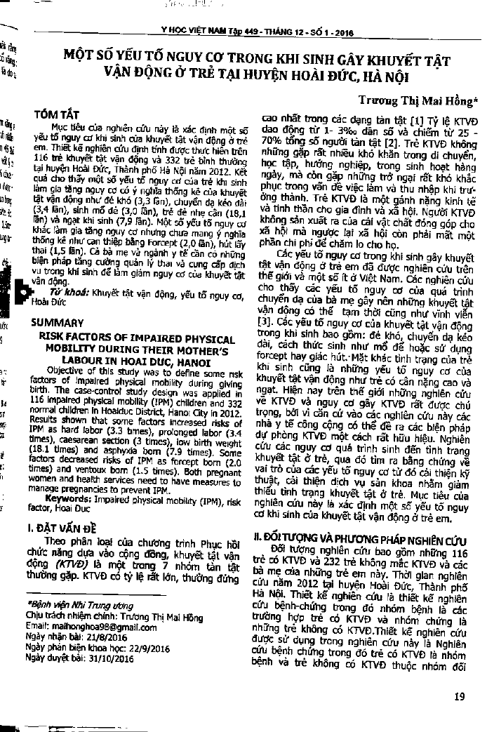 Nghiên cứu nhằm xác định một số yếu tố nguy cơ khi sinh của khuyết tật vận động ở trẻ em. Một số yếu tố nguy cơ có ý nghĩa thống kê của khuyết tật vận động như đẻ khó, chuyển dạ kéo dài, sinh mổ đẻ, trẻ đẻ nhẹ cân và ngạt khi sinh. Một số yếu tố nguy cơ khác làm gia tăng nguy cơ nhưng chưa mang ý nghĩa thống kê như can thiệp bằng Forcept, hút lấy thai. Cả bà mẹ và ngành y tế cần có những biện pháp tăng cường quản lý thai và cung cấp dịch vụ trong khi sinh để làm giảm nguy cơ của khuyết tật vận động.