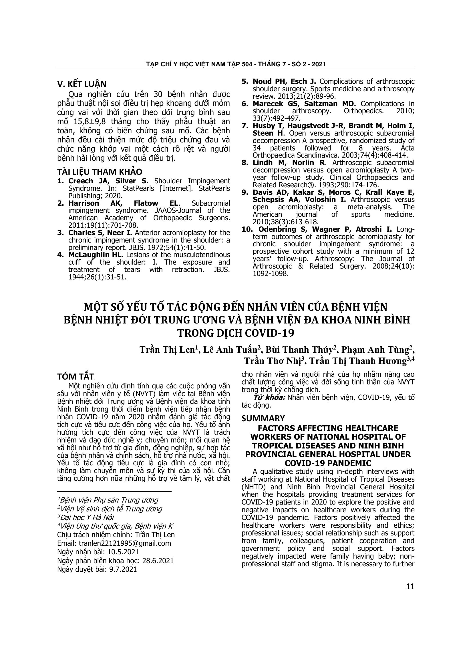 Một số yếu tố tác động đến nhân viên của bệnh viện Nhiệt đới Trung ương và bệnh viện Đa khoa Ninh Bình trong dịch Covid-19