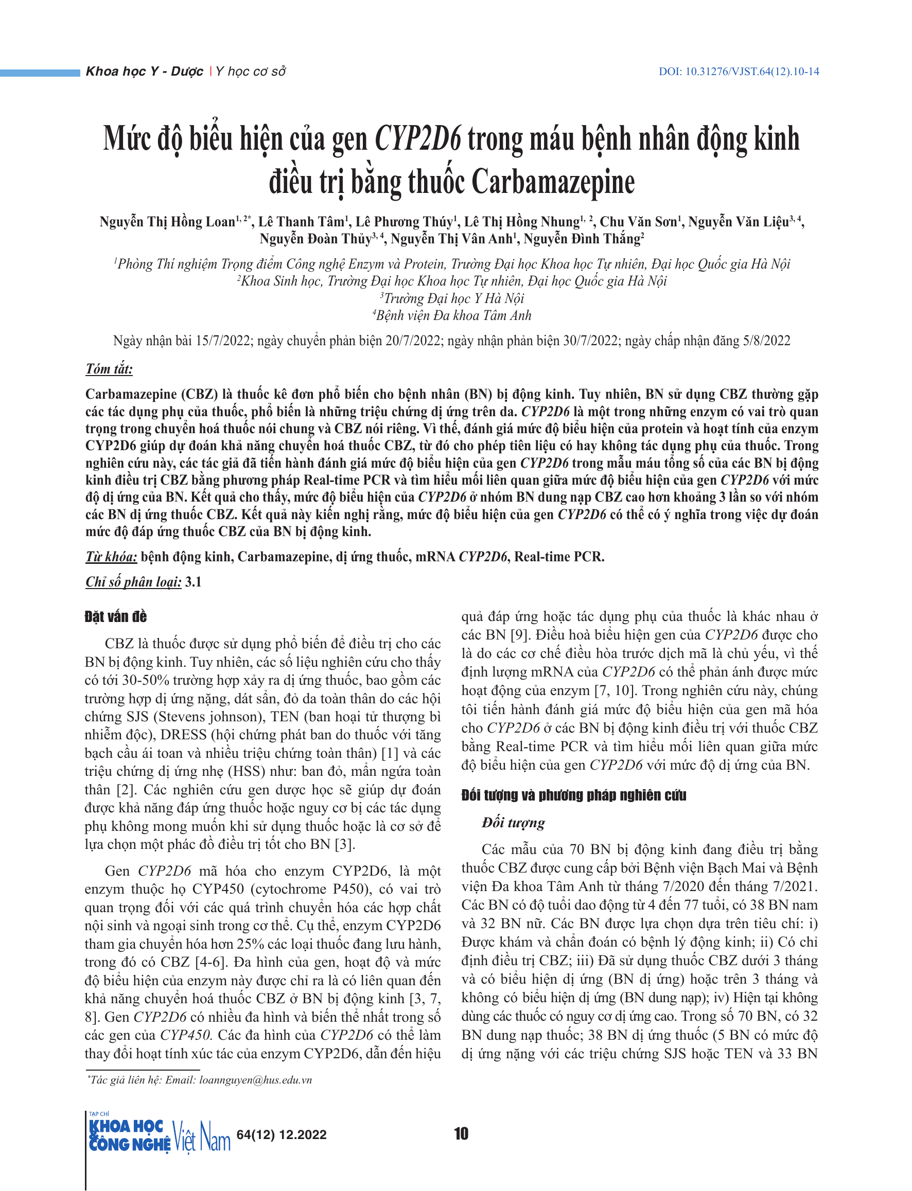 Carbamazepine (CBZ) là thuốc kê đơn phổ biến cho bệnh nhân (BN) bị động kinh. Tuy nhiên, BN sử dụng CBZ thường gặp các tác dụng phụ của thuốc, phổ biến là những triệu chứng dị ứng trên da. CYP2D6 là một trong những enzym có vai trò quan trọng trong chuyển hoá thuốc nói chung và CBZ nói riêng. Vì thế, đánh giá mức độ biểu hiện của protein và hoạt tính của enzym CYP2D6 giúp dự đoán khả năng chuyển hoá thuốc CBZ, từ đó cho phép tiên liệu có hay không tác dụng phụ của thuốc. Trong nghiên cứu này, các tác giả đã tiến hành đánh giá mức độ biểu hiện của gen CYP2D6 trong mẫu máu tổng số của các BN bị động kinh điều trị CBZ bằng phương pháp Real-time PCR và tìm hiểu mối liên quan giữa mức độ biểu hiện của gen CYP2D6 với mức độ dị ứng của BN. Kết quả cho thấy, mức độ biểu hiện của CYP2D6 ở nhóm BN dung nạp CBZ cao hơn khoảng 3 lần so với nhóm các BN dị ứng thuốc CBZ. Kết quả này kiến nghị rằng, mức độ biểu hiện của gen CYP2D6 có thể có ý nghĩa trong việc dự đoán mức độ đáp ứng thuốc CBZ của BN bị động kinh.