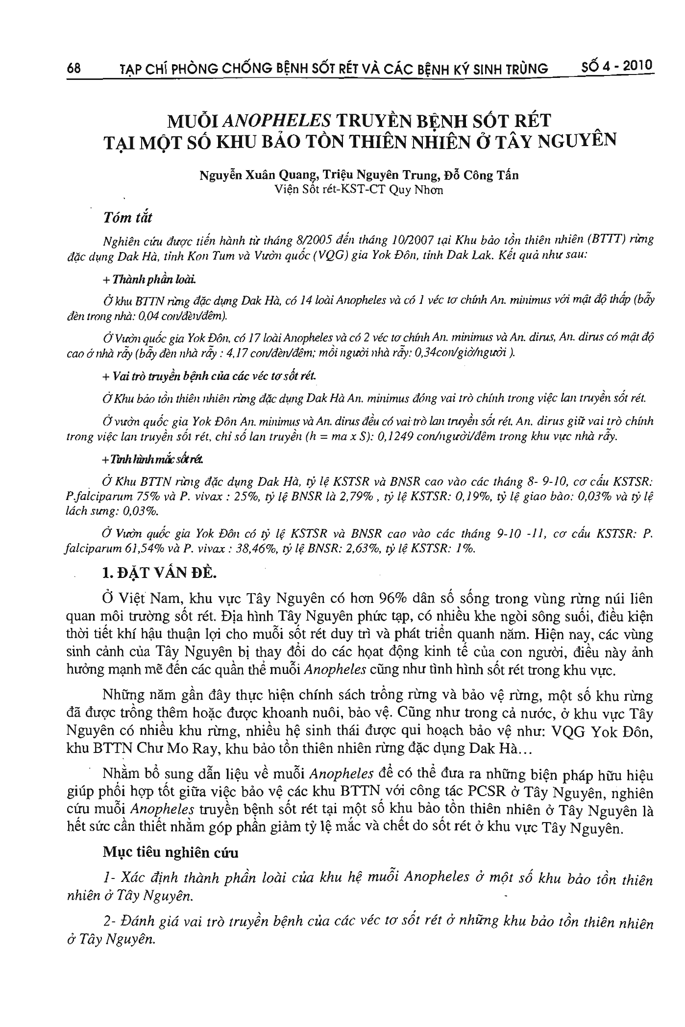 Muỗi Anopheles truyền bệnh sốt rét tại một số khu bảo tồn thiên nhiên ở Tây Nguyên