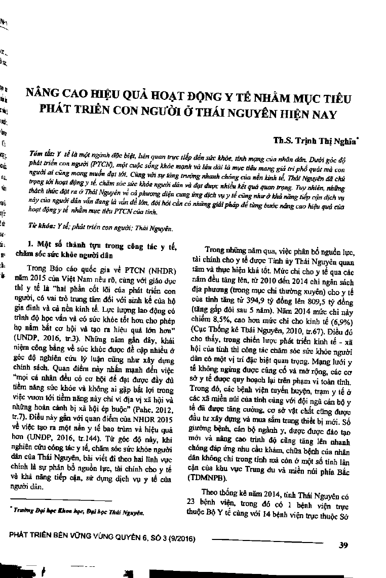 Health care plays an important role for people's life. From the perspective of human development, a healthy and long-lasting life is an universal goal which every human desires to achieve. In spite of economy's rapid expansion, the challenges for Thai Nguyen in both providing and accessing health care services have been big problems that need solutions to improve the efficiency of health care services, contributing to the human development of the province.
