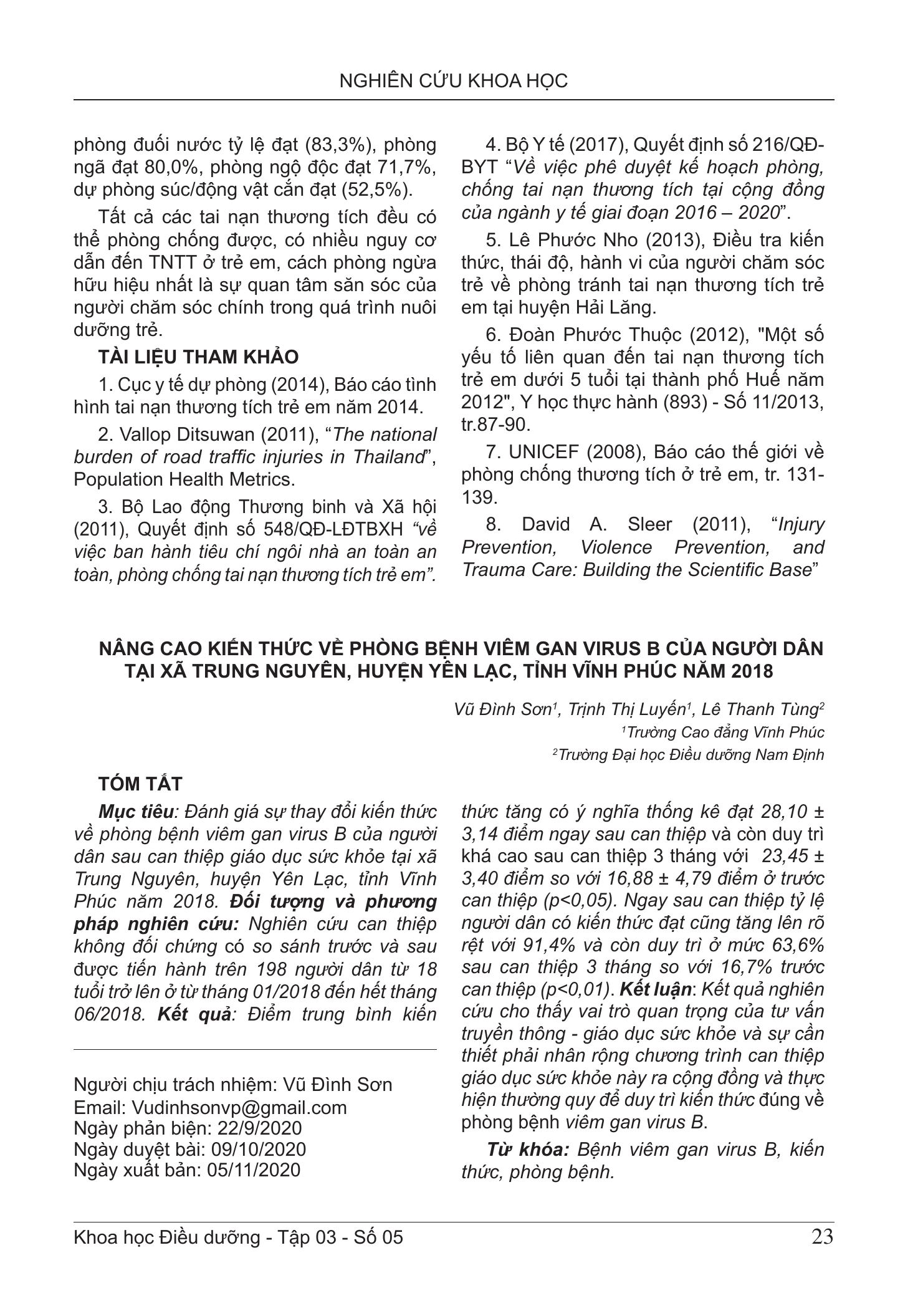 Assessment of changes in people’s knowledge about hepatitis B prevention after health education intervention in Trung Nguyen commune, Yen Lac district, Vinh Phuc province in 2018. Method An uncontrolled intervention study with pre and post comparison was conducted on 198 people aged 18 years and over who stayed f-rom January 2018 to the end of June 2018. Results Results showed that the average score of knowledge increased and statistically significant at 28.10 ± 3.14 points after the intervention and remained high after 3 months of intervention with 23, 45 ± 3.40 points compared with 16.88 ± 4.79 points before intervention (p <0.05). Immediately after health education, the percentage of people with knowledge has increased significantly with 91.4% and remained at 63.6% after 3 months of intervention compared to 16.7% before intervention (p <0.01). Conclusion Results show the important role of communication counseling - health education and the need to scale up this health education intervention program to the community and routine implementation to maintain proper knowledge about hepatitis B prevention.