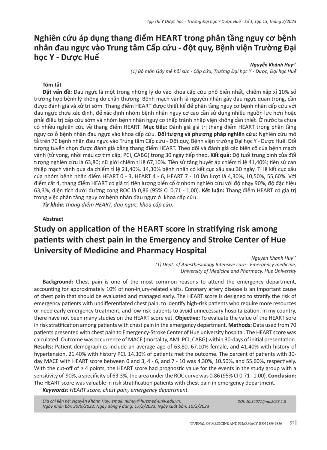 Đánh giá giá trị thang điểm HEART trong phân tầng nguy cơ ở bệnh nhân đau ngực vào khoa cấp cứu. Đối tượng và phương pháp nghiên cứu: Nghiên cứu mô tả trên 70 bệnh nhân đau ngực vào Trung tâm Cấp cứu - Đột quỵ, Bệnh viện trường Đại học Y - Dược Huế. Đối tượng tuyển chọn được đánh giá bằng thang điểm HEART. Theo dõi và đánh giá các biến cố của bệnh mạch vành (tử vong, nhồi máu cơ tim cấp, PCI, CABG) trong 30 ngày tiếp theo. Kết quả: Độ tuổi trung bình của đối tượng nghiên cứu là 63,80; nữ giới chiếm tỉ lệ 67,10%. Tiền sử tăng huyết áp chiếm tỉ lệ 41,40%; tiền sử can thiệp mạch vành qua da chiếm tỉ lệ 21,40%. 14,30% bệnh nhân có kết cục xấu sau 30 ngày. Tỉ lệ kết cục xấu của nhóm bệnh nhân điểm HEART 0 - 3, HEART 4 - 6, HEART 7 - 10 lần lượt là 4,30%, 10,50%, 55,60%. Với điểm cắt 4, thang điểm HEART có giá trị tiên lượng biến cố ở nhóm nghiên cứu với độ nhạy 90%, độ đặc hiệu 63,3%, diện tích dưới đường cong ROC là 0,86 (95% CI 0,71 - 1,00). Kết luận: Thang điểm HEART có giá trị trong việc phân tầng nguy cơ bệnh nhân đau ngực ở khoa cấp cứu.