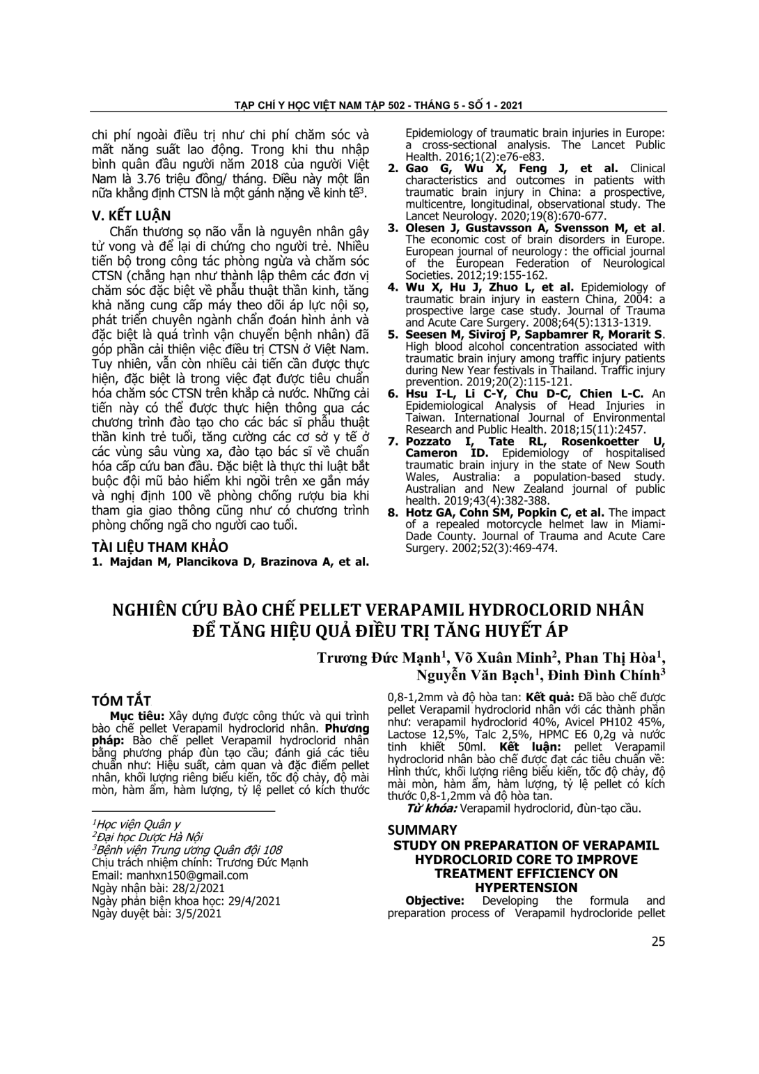 Xây dựng được công thức và qui trình bào chế pellet Verapamil hydroclorid nhân. Phương pháp: Bào chế pellet Verapamil hydroclorid nhân bằng phương pháp đùn tạo cầu; đánh giá các tiêu chuẩn như: Hiệu suất, cảm quan và đặc điểm pellet nhân, khối lượng riêng biểu kiến, tốc độ chảy, độ mài mòn, hàm ẩm, hàm lượng, tỷ lệ pellet có kích thước 0,8-1,2mm và độ hòa tan: Kết quả: Đã bào chế được pellet Verapamil hydroclorid nhân với các thành phần như: verapamil hydroclorid 40%, Avicel PH102 45%, Lactose 12,5%, Talc 2,5%, HPMC E6 0,2g và nước tinh khiết 50ml. Kết luận: pellet Verapamil hydroclorid nhân bào chế được đạt các tiêu chuẩn về: Hình thức, khối lượng riêng biểu kiến, tốc độ chảy, độ mài mòn, hàm ẩm, hàm lượng, tỷ lệ pellet có kích thước 0,8-1,2mm và độ hòa tan.