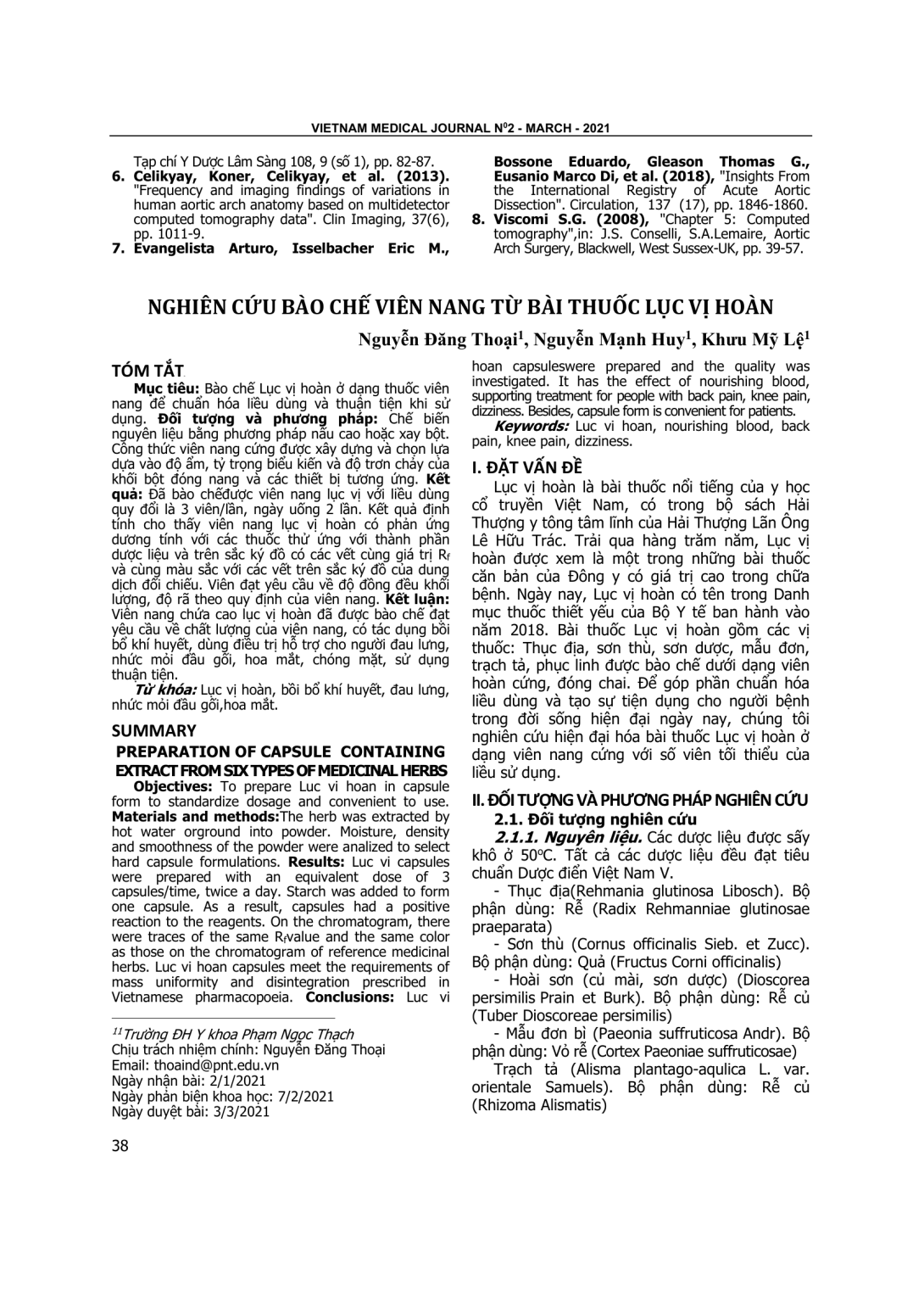 Bào chế Lục vị hoàn ở dạng thuốc viên nang để chuẩn hóa liều dùng và thuận tiện khi sử dụng. Đối tượng và phương pháp: Chế biến nguyên liệu bằng phương pháp nấu cao hoặc xay bột. Công thức viên nang cứng được xây dựng và chọn lựa dựa vào độ ẩm, tỷ trọng biểu kiến và độ trơn chảy của khối bột đóng nang và các thiết bị tương ứng. Kết quả: Đã bào chếđược viên nang lục vị với liều dùng quy đổi là 3 viên/lần, ngày uống 2 lần. Kết quả định tính cho thấy viên nang lục vị hoàn có phản ứng dương tính với các thuốc thử ứng với thành phần dược liệu và trên sắc ký đồ có các vết cùng giá trị Rf và cùng màu sắc với các vết trên sắc ký đồ của dung dịch đối chiếu. Viên đạt yêu cầu về độ đồng đều khối lượng, độ rã theo quy định của viên nang. Kết luận: Viên nang chứa cao lục vị hoàn đã được bào chế đạt yêu cầu về chất lượng của viên nang, có tác dụng bồi bổ khí huyết, dùng điều trị hỗ trợ cho người đau lưng, nhức mỏi đầu gối, hoa mắt, chóng mặt, sử dụng thuận tiện.