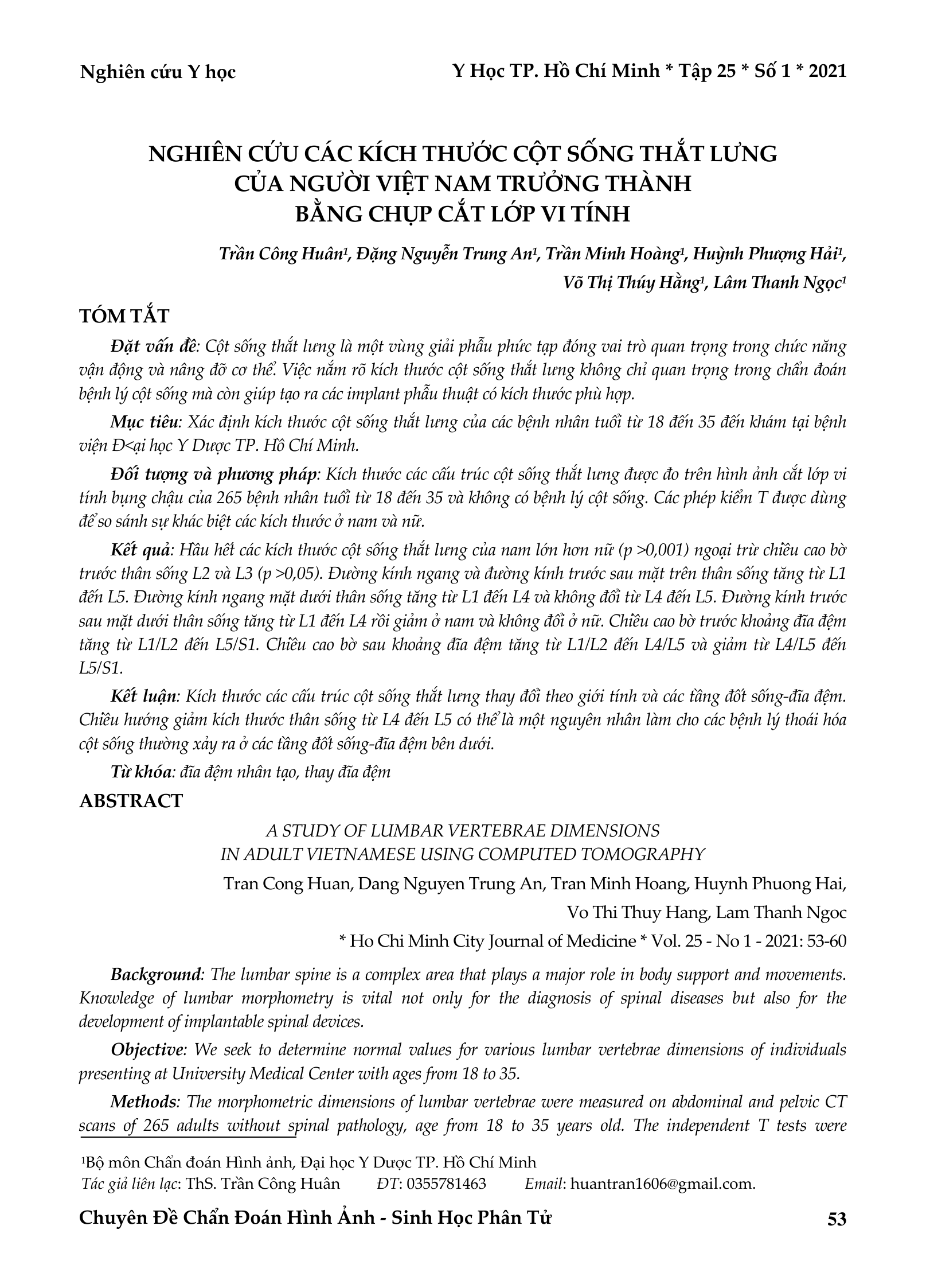 Xác định kích thước cột sống thắt lưng của các bệnh nhân tuổi từ 18 đến 35 đến khám tại bệnh viện Đ<ại học Y Dược TP. Hồ Chí Minh. Đối tượng và phương pháp: Kích thước các cấu trúc cột sống thắt lưng được đo trên hình ảnh cắt lớp vi tính bụng chậu của 265 bệnh nhân tuổi từ 18 đến 35 và không có bệnh lý cột sống. Các phép kiểm T được dùng để so sánh sự khác biệt các kích thước ở nam và nữ. Kết quả: Hầu hết các kích thước cột sống thắt lưng của nam lớn hơn nữ (p >0,001) ngoại trừ chiều cao bờ trước thân sống L2 và L3 (p >0,05). Đường kính ngang và đường kính trước sau mặt trên thân sống tăng từ L1 đến L5. Đường kính ngang mặt dưới thân sống tăng từ L1 đến L4 và không đổi từ L4 đến L5. Đường kính trước sau mặt dưới thân sống tăng từ L1 đến L4 rồi giảm ở nam và không đổi ở nữ. Chiều cao bờ trước khoảng đĩa đệm tăng từ L1/L2 đến L5/S1. Chiều cao bờ sau khoảng đĩa đệm tăng từ L1/L2 đến L4/L5 và giảm từ L4/L5 đến L5/S1. Kết luận: Kích thước các cấu trúc cột sống thắt lưng thay đổi theo giới tính và các tầng đốt sống-đĩa đệm. Chiều hướng giảm kích thước thân sống từ L4 đến L5 có thể là một nguyên nhân làm cho các bệnh lý thoái hóa cột sống thường xảy ra ở các tầng đốt sống-đĩa đệm bên dưới.