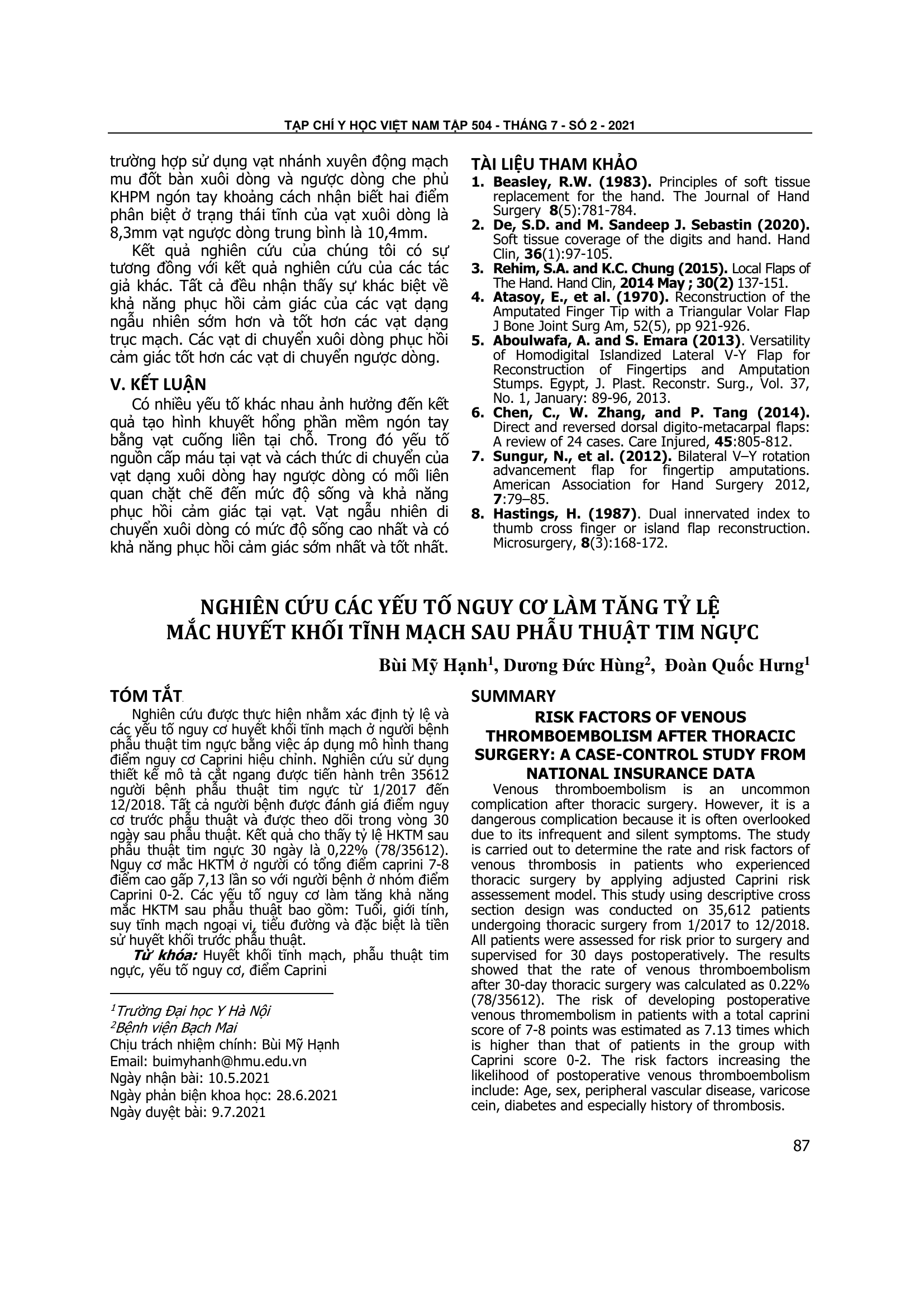 Nghiên cứu được thực hiện nhằm xác định tỷ lệ và các yếu tố nguy cơ huyết khối tĩnh mạch ở người bệnh phẫu thuật tim ngực bằng việc áp dụng mô hình thang điểm nguy cơ Caprini hiệu chỉnh. Nghiên cứu sử dụng thiết kế mô tả cắt ngang được tiến hành trên 35612 người bệnh phẫu thuật tim ngực từ 1/2017 đến 12/2018. Tất cả người bệnh được đánh giá điểm nguy cơ trước phẫu thuật và được theo dõi trong vòng 30 ngày sau phẫu thuật. Kết quả cho thấy tỷ lệ HKTM sau phẫu thuật tim ngực 30 ngày là 0,22% (78/35612). Nguy cơ mắc HKTM ở người có tổng điểm caprini 7-8 điểm cao gấp 7,13 lần so với người bệnh ở nhóm điểm Caprini 0-2. Các yếu tố nguy cơ làm tăng khả năng mắc HKTM sau phẫu thuật bao gồm: Tuổi, giới tính, suy tĩnh mạch ngoại vi, tiểu đường và đặc biệt là tiền sử huyết khối trước phẫu thuật.