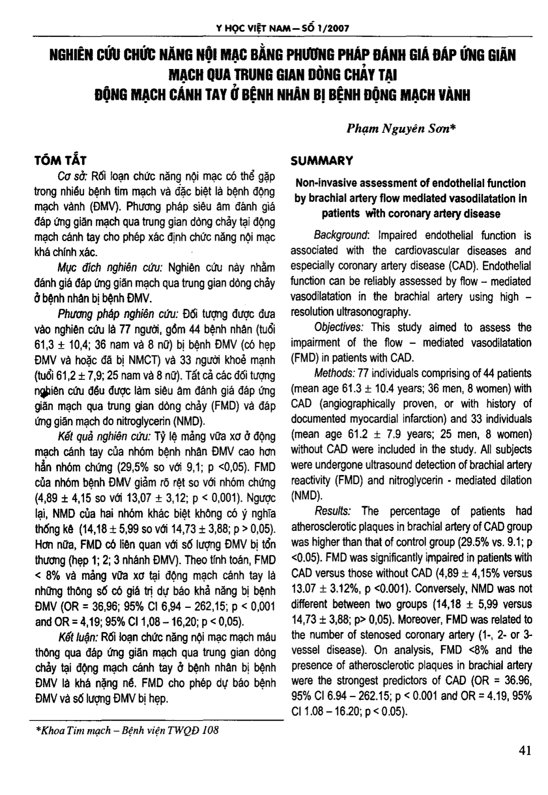 Nghiên cứu chức năng nội mạc bằng phương pháp đánh gia đáp ứng giãn mạch qua trung gian dòng chảy tại động mạch cánh tay ở bệnh nhân bị bệnh động mạch vành