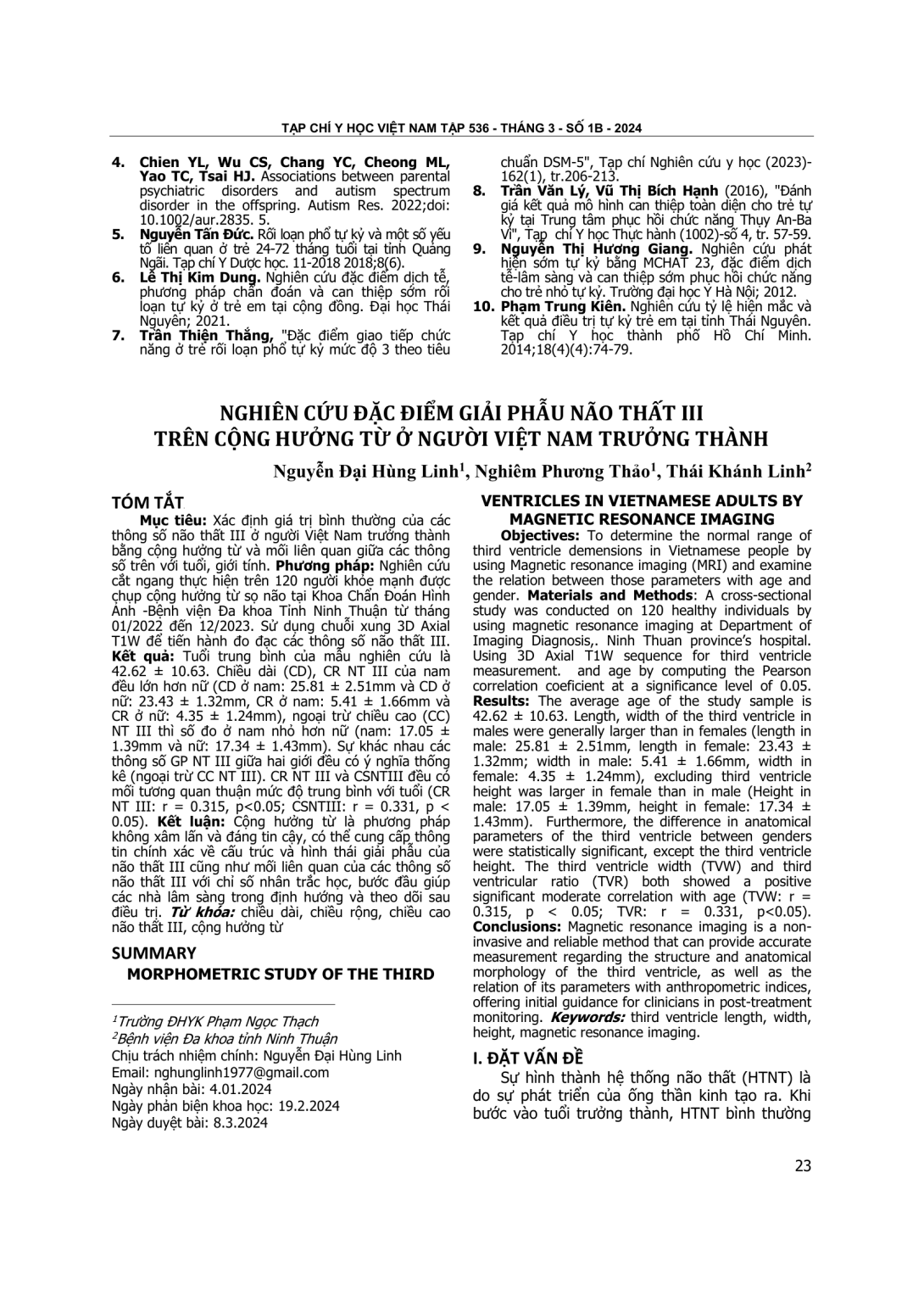 Xác định giá trị bình thường của các thông số não thất III ở người Việt Nam trưởng thành bằng cộng hưởng từ và mối liên quan giữa các thông số trên với tuổi, giới tính. Phương pháp: Nghiên cứu cắt ngang thực hiện trên 120 người khỏe mạnh được chụp cộng hưởng từ sọ não tại Khoa Chẩn Đoán Hình Ảnh -Bệnh viện Đa khoa Tỉnh Ninh Thuận từ tháng 01/2022 đến 12/2023. Sử dụng chuỗi xung 3D Axial T1W để tiến hành đo đạc các thông số não thất III. Kết quả: Tuổi trung bình của mẫu nghiên cứu là 42.62 ± 10.63. Chiều dài (CD), CR NT III của nam đều lớn hơn nữ (CD ở nam: 25.81 ± 2.51mm và CD ở nữ: 23.43 ± 1.32mm, CR ở nam: 5.41 ± 1.66mm và CR ở nữ: 4.35 ± 1.24mm), ngoại trừ chiều cao (CC) NT III thì số đo ở nam nhỏ hơn nữ (nam: 17.05 ± 1.39mm và nữ: 17.34 ± 1.43mm). Sự khác nhau các thông số GP NT III giữa hai giới đều có ý nghĩa thống kê (ngoại trừ CC NT III). CR NT III và CSNTIII đều có mối tương quan thuận mức độ trung bình với tuổi (CR NT III: r = 0.315, p<0.05; CSNTIII: r = 0.331, p < 0.05). Kết luận: Cộng hưởng từ là phương pháp không xâm lấn và đáng tin cậy, có thể cung cấp thông tin chính xác về cấu trúc và hình thái giải phẫu của não thất III cũng như mối liên quan của các thông số não thất III với chỉ số nhân trắc học, bước đầu giúp các nhà lâm sàng trong định hướng và theo dõi sau điều trị.