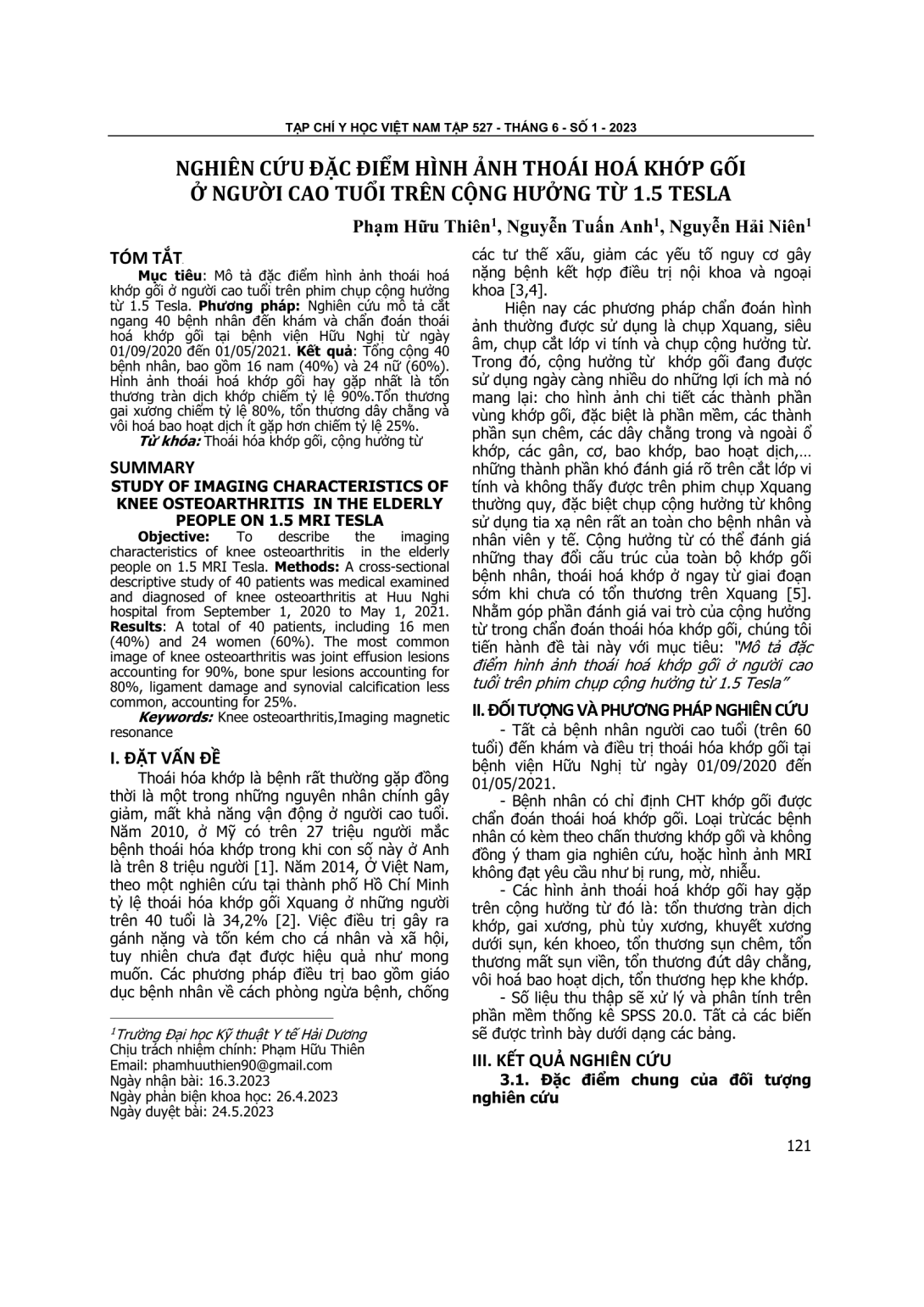 Mô tả đặc điểm hình ảnh thoái hoá khớp gối ở người cao tuổi trên phim chụp cộng hưởng từ 1.5 Tesla. Phương pháp: Nghiên cứu mô tả cắt ngang 40 bệnh nhân đến khám và chẩn đoán thoái hoá khớp gối tại bệnh viện Hữu Nghị từ ngày 01/09/2020 đến 01/05/2021. Kết quả: Tổng cộng 40 bệnh nhân, bao gồm 16 nam (40%) và 24 nữ (60%). Hình ảnh thoái hoá khớp gối hay gặp nhất là tổn thương tràn dịch khớp chiếm tỷ lệ 90%.Tổn thương gai xương chiếm tỷ lệ 80%, tổn thương dây chằng và vôi hoá bao hoạt dịch ít gặp hơn chiếm tỷ lệ 25%.