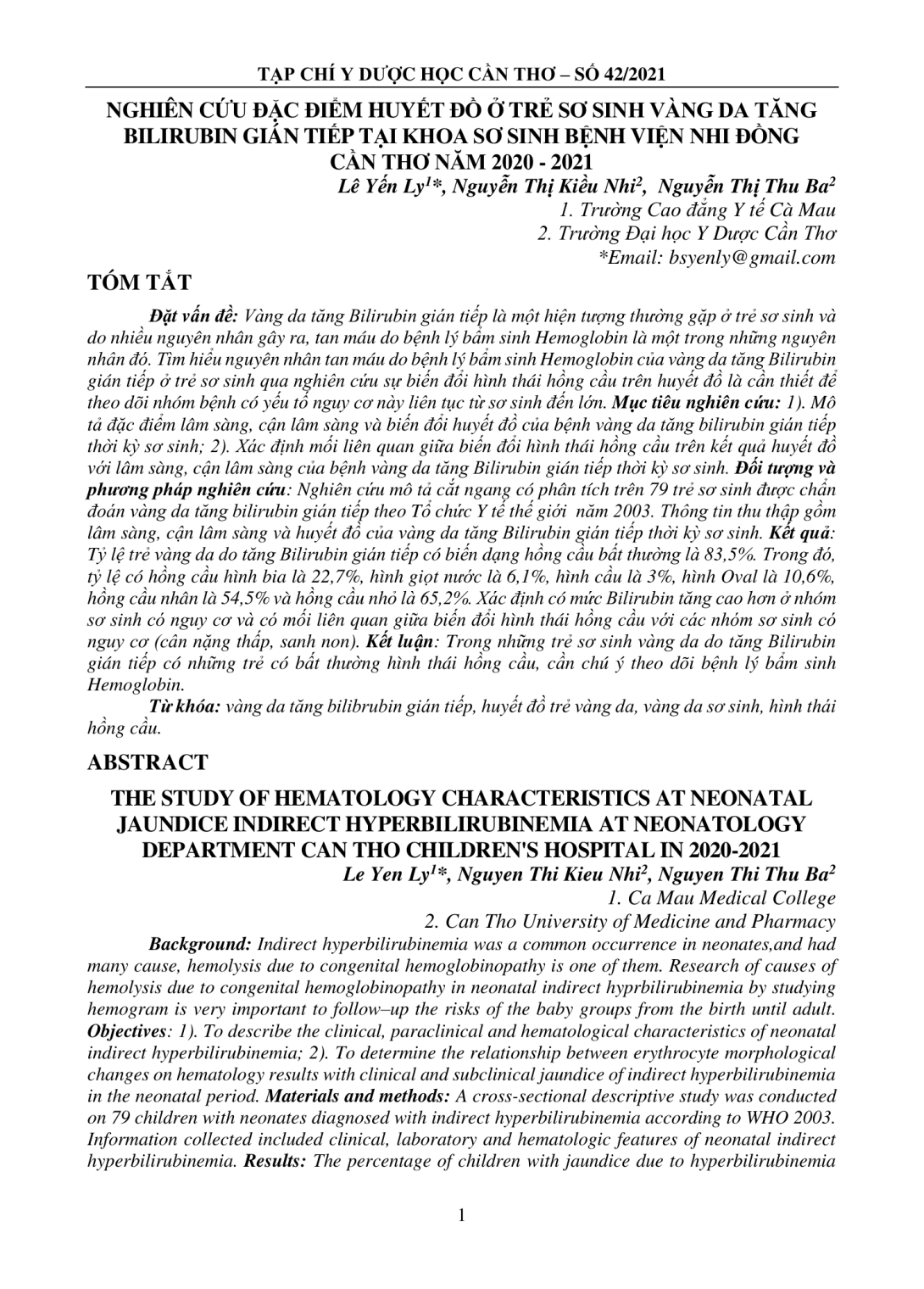 Vàng da tăng Bilirubin gián tiếp là một hiện tượng thường gặp ở trẻ sơ sinh và do nhiều nguyên nhân gây ra, tan máu do bệnh lý bẩm sinh Hemoglobin là một trong những nguyên nhân đó. Tìm hiểu nguyên nhân tan máu do bệnh lý bẩm sinh Hemoglobin của vàng da tăng Bilirubin gián tiếp ở trẻ sơ sinh qua nghiên cứu sự biến đổi hình thái hồng cầu trên huyết đồ là cần thiết để theo dõi nhóm bệnh có yếu tố nguy cơ này liên tục từ sơ sinh đến lớn. Mục tiêu nghiên cứu: 1). Mô tả đặc điểm lâm sàng, cận lâm sàng và biến đổi huyết đồ của bệnh vàng da tăng bilirubin gián tiếp thời kỳ sơ sinh; 2). Xác định mối liên quan giữa biến đổi hình thái hồng cầu trên kết quả huyết đồ với lâm sàng, cận lâm sàng của bệnh vàng da tăng Bilirubin gián tiếp thời kỳ sơ sinh. Đối tượng và phương pháp nghiên cứu: Nghiên cứu mô tả cắt ngang có phân tích trên 79 trẻ sơ sinh được chẩn đoán vàng da tăng bilirubin gián tiếp theo Tổ chức Y tế thế giới năm 2003. Thông tin thu thập gồm lâm sàng, cận lâm sàng và huyết đồ của vàng da tăng Bilirubin gián tiếp thời kỳ sơ sinh. Kết quả: Tỷ lệ trẻ vàng da do tăng Bilirubin gián tiếp có biến dạng hồng cầu bất thường là 83,5%. Trong đó, tỷ lệ có hồng cầu hình bia là 22,7%, hình giọt nước là 6,1%, hình cầu là 3%, hình Oval là 10,6%, hồng cầu nhân là 54,5% và hồng cầu nhỏ là 65,2%. Xác định có mức Bilirubin tăng cao hơn ở nhóm sơ sinh có nguy cơ và có mối liên quan giữa biến đổi hình thái hồng cầu với các nhóm sơ sinh có nguy cơ (cân nặng thấp, sanh non). Kết luận: Trong những trẻ sơ sinh vàng da do tăng Bilirubin gián tiếp có những trẻ có bất thường hình thái hồng cầu, cần chú ý theo dõi bệnh lý bẩm sinh Hemoglobin.