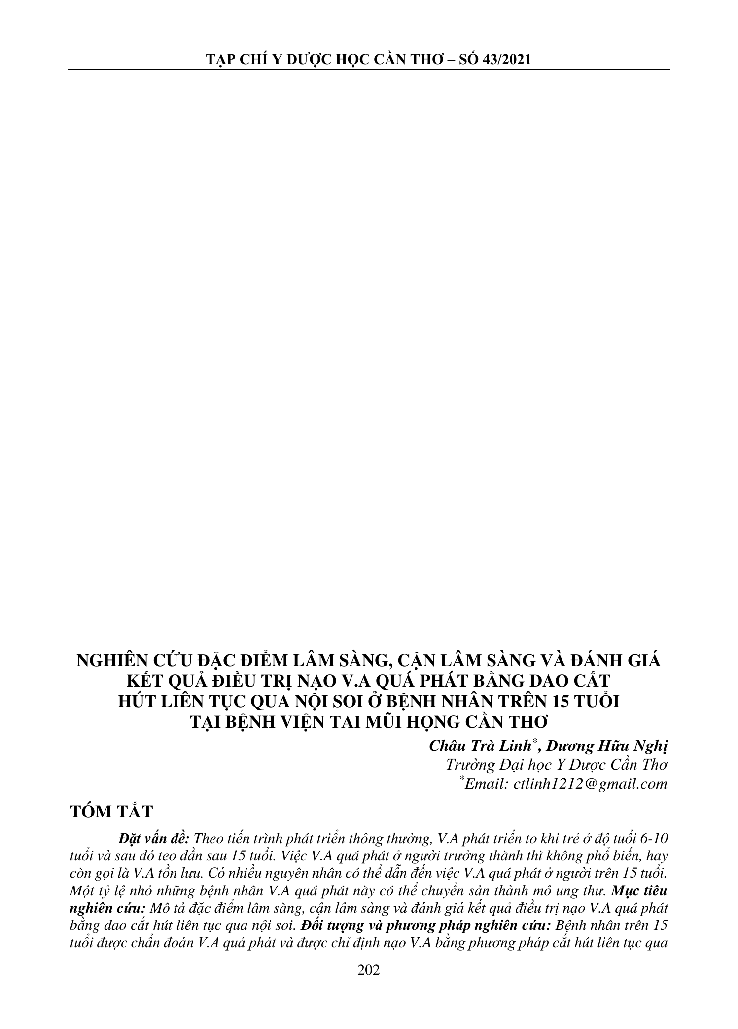 Theo tiến trình phát triển thông thường, V.A phát triển to khi trẻ ở độ tuổi 6-10 tuổi và sau đó teo dần sau 15 tuổi. Việc V.A quá phát ở người trưởng thành thì không phổ biến, hay còn gọi là V.A tồn lưu. Có nhiều nguyên nhân có thể dẫn đến việc V.A quá phát ở người trên 15 tuổi. Một tỷ lệ nhỏ những bệnh nhân V.A quá phát này có thể chuyển sản thành mô ung thư. Mục tiêu nghiên cứu: Mô tả đặc điểm lâm sàng, cận lâm sàng và đánh giá kết quả điều trị nạo V.A quá phát bằng dao cắt hút liên tục qua nội soi. Đối tượng và phương pháp nghiên cứu: Bệnh nhân trên 15 tuổi được chẩn đoán V.A quá phát và được chỉ định nạo V.A bằng phương pháp cắt hút liên tục qua nội soi tại Bệnh viện Tai Mũi Họng Cần Thơ. Kết quả: Nghiên cứu ghi nhận 102 trường hợp V.A quá phát (55 nam và 47 nữ), có độ tuổi từ 15-59 tuổi. Đa số bệnh nhân có V.A quá phát độ II với 60,8%. Triệu chứng hay gặp của các bệnh nhân là nghẹt mũi, chảy mũi sau, đau đầu, ù tai, nuốt vướng. Trong 102 bệnh nhân này chúng tôi có 51 trường hợp nạo V.A đơn thuần và 51 trường hợp nạo V.A phối hợp phẫu thuật khác (chỉnh hình vách ngăn/chỉnh hình cuốn mũi/mở xoang hàm,sàng/cắt amidan/vá nhĩ/tạo hình tai giữa/đặt ống thông khí). Kết luận: Sau phẫu thuật 3 tháng, hầu hết các triệu chứng cơ năng đều cải thiện so với trước mổ. Giải phẫu bệnh mô V.A ra lành tính 95,7%, 2,9% tổn thương lymphô biểu mô chưa loại trừ caricinoma và 1,4% carcinoma.