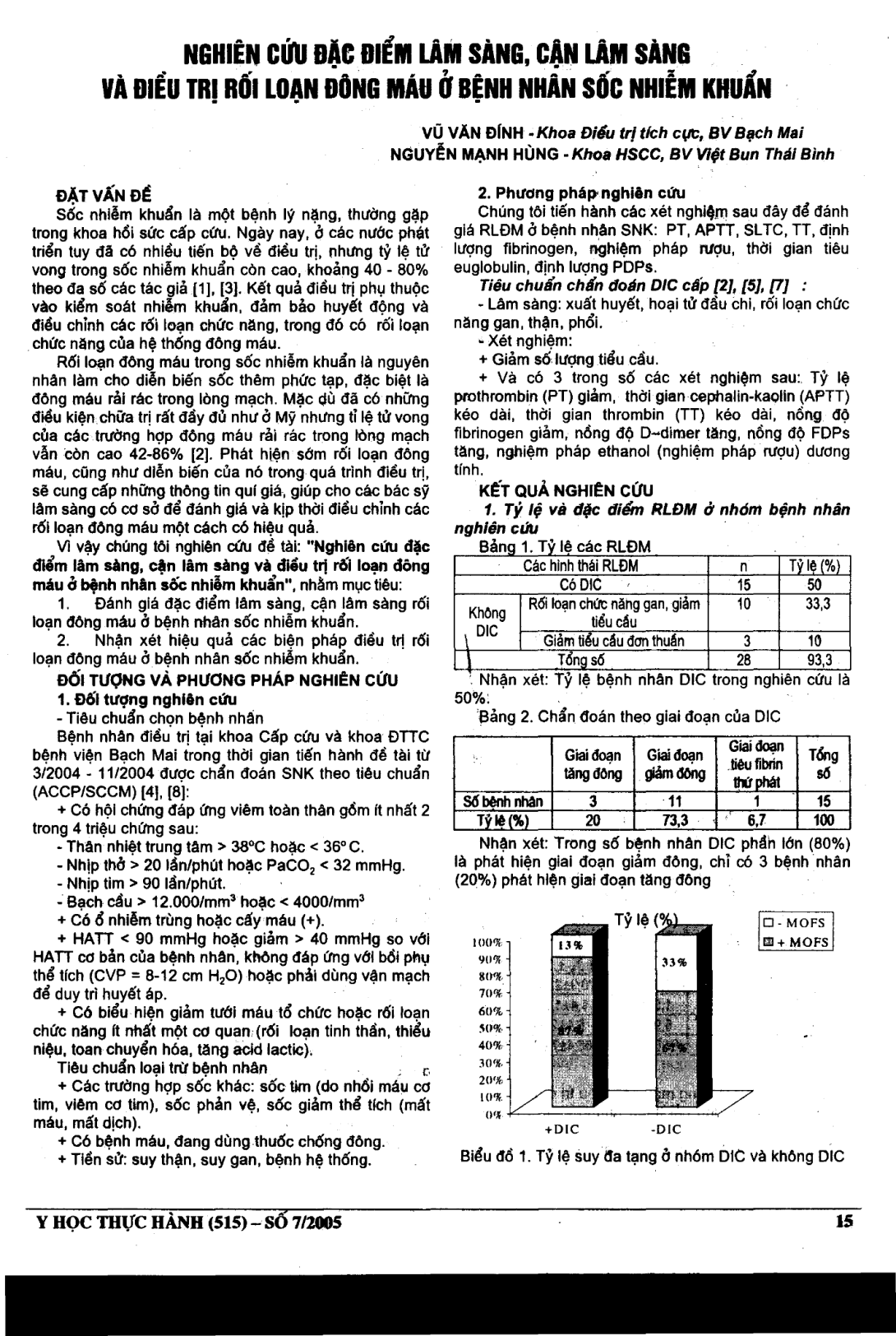 BinhfNghieen cứu rối loạn đông máu (RLĐM)[r 30 bênh nhân bị sốc nhiễm khuẩn (SNK) và có một số nhận xét. Về đặc điểm lâm sàng: RLDDM có biểu hiện ban đầu là xuất huyết dưới da chiếm 86,6% , xuất huyết nội tạng chiếm 26,6% ; thiếu máu là hậu quả của xuất huyết và nhiễm khuẩn nặng (chiếm 76,7% ). Về đặc điểm cận lâm sàng: DIC xảy ra ở 50% bệnh nhân (trong đó 20% biểu hiện tăng đông. RLDDM do số nhiễm khuẩn làm suy đa tạng và tăng tỷ lệ tử vong.