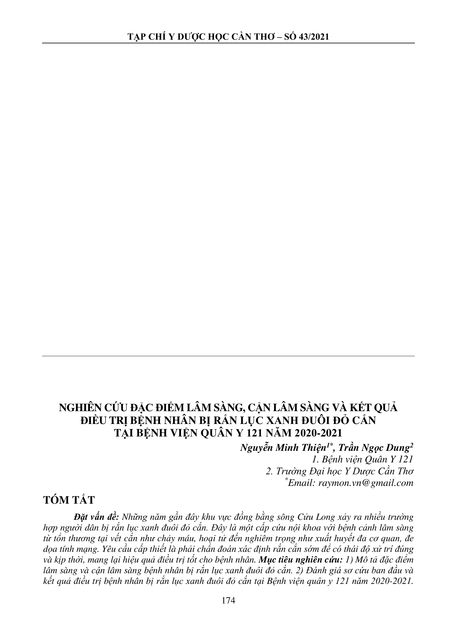 Những năm gần đây khu vực đồng bằng sông Cửu Long xảy ra nhiều trường hợp người dân bị rắn lục xanh đuôi đỏ cắn. Đây là một cấp cứu nội khoa với bệnh cảnh lâm sàng từ tổn thương tại vết cắn như chảy máu, hoại tử đến nghiêm trọng như xuất huyết đa cơ quan, đe dọa tính mạng. Yêu cầu cấp thiết là phải chẩn đoán xác định rắn cắn sớm để có thái độ xử trí đúng và kịp thời, mang lại hiệu quả điều trị tốt cho bệnh nhân. Mục tiêu nghiên cứu: 1) Mô tả đặc điểm lâm sàng và cận lâm sàng bệnh nhân bị rắn lục xanh đuôi đỏ cắn. 2) Đánh giá sơ cứu ban đầu và kết quả điều trị bệnh nhân bị rắn lục xanh đuôi đỏ cắn tại Bệnh viện quân y 121 năm 2020-2021. Đối trượng và phương pháp nghiên cứu: Mô tả cắt ngang trên 110 bệnh nhân được chẩn đoán rắn lục xanh đuôi đỏ cắn và điều trị tại bệnh viện Quân Y 121 từ tháng 08/2020 đến tháng 02/2021. Kết quả: Bệnh nhân đa số là nam giới, chiếm 76,4%, chủ yếu trong độ tuổi lao động (55,5%). Triệu chứng đau, sưng vết cắn chiếm 100%. Bệnh nhân có rối loạn đông cầm máu chiếm 37,3%. Tỷ lệ bệnh nhân được sơ cứu đúng trước nhập viện là 12,7%. 100% bệnh nhân hồi phục hoàn toàn sau điều trị. Kết luận: Triệu chứng lâm sàng và cận lâm sàng điển hình của bệnh nhân bị rắn lục xanh đuôi đỏ cắn là sưng, đau vết cắn và rối loạn đông cầm máu. Tỷ lệ bệnh nhân được sơ cứu ban đầu đúng còn thấp. Điều trị đặc hiệu bằng huyết thanh kháng nọc rắn đem lại kết quả điều trị tốt cho bệnh nhân.