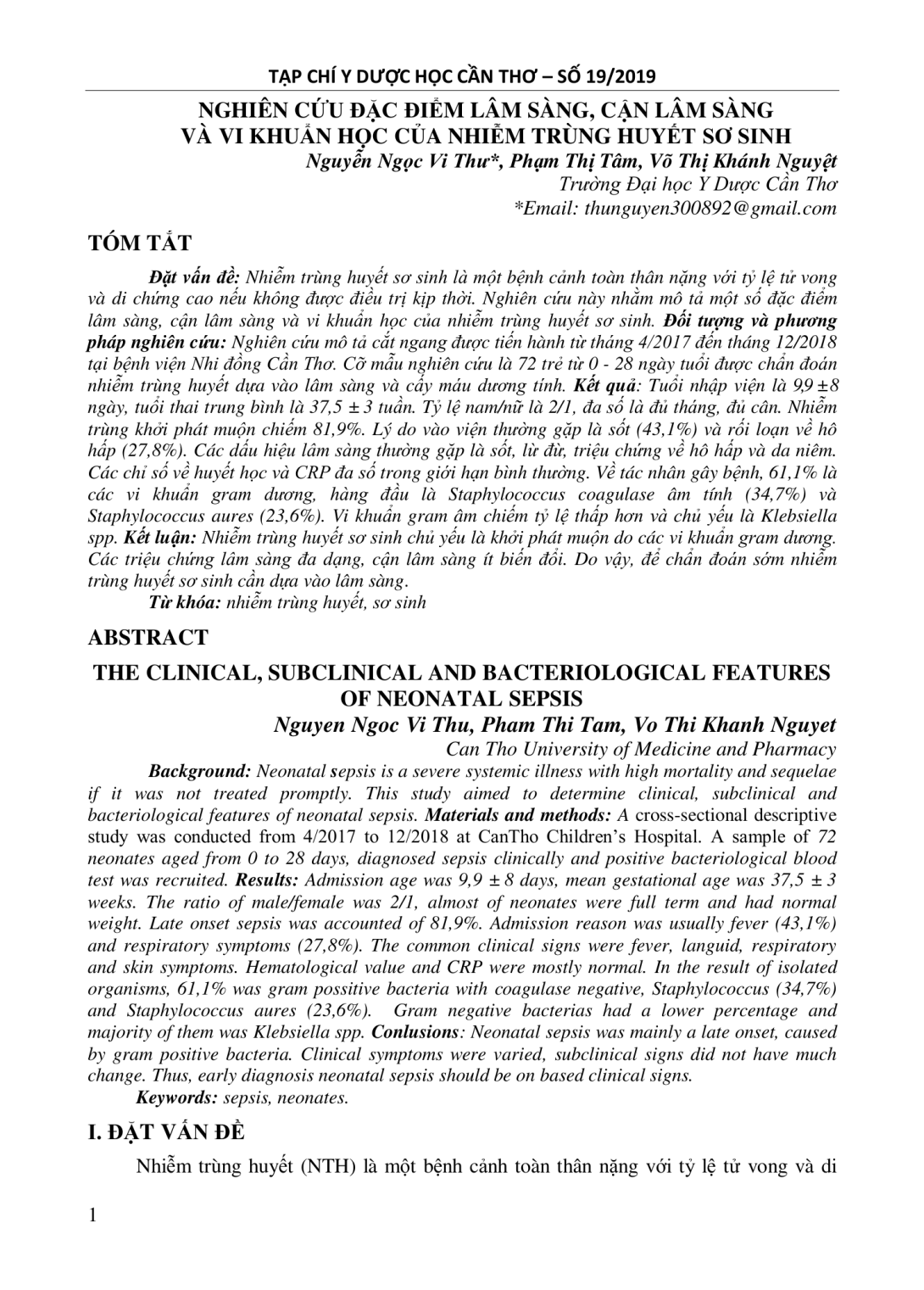 Mô tả một số đặc điểm lâm sàng, cận lâm sàng và vi khuẩn học của nhiễm trùng huyết sơ sinh. Nghiên cứu mô tả cắt ngang được tiến hành từ tháng 4/2017 đến tháng 12/2018 tại bệnh viện Nhi đồng Cần Thơ. Cỡ mẫu nghiên cứu là 72 trẻ từ 0 - 28 ngày tuổi được chẩn đoán nhiễm trùng huyết dựa vào lâm sàng và cấy máu dương tính. Kết quả Tuổi nhập viện là 9,9 ± 8 ngày, tuổi thai trung bình là 37,5 ± 3 tuần. Tỷ lệ nam/nữ là 2/1, đa số là đủ tháng, đủ cân. Nhiễm trùng khởi phát muộn chiếm 81,9%. Lý do vào viện thường gặp là sốt (43,1%) và rối loạn về hô hấp (27,8%). Các dấu hiệu lâm sàng thường gặp là sốt, lừ đừ, triệu chứng về hô hấp và da niêm. Các chỉ số về huyết học và CRP đa số trong giới hạn bình thường. Về tác nhân gây bệnh, 61,1% là các vi khuẩn gram dương, hàng đầu là Staphylococcus coagulase âm tính (34,7%) và Staphylococcus aureus (23,6%). Vi khuẩn gram âm chiếm tỷ lệ thấp hơn và chủ yếu là Klebsiella spp.