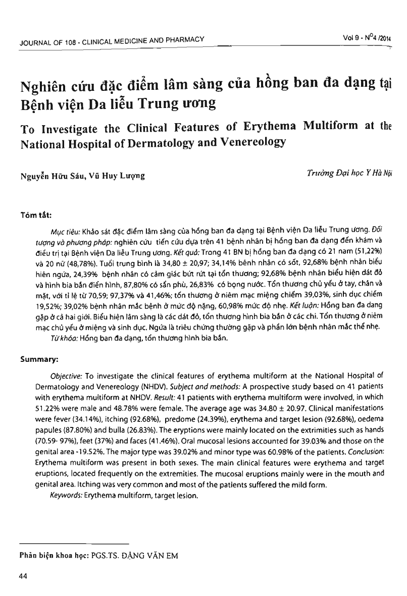 Objective: To investigate the clinical features of erythema multiform at the National Hospital of Dermatology and Venereology (NHDV). Subject and methods: A prospective study based pn 41 patients with erythema multiform at NHDV. Result: 41 patients with erythema multiform were involved, in which 51.22 percent were male and 48.78 percent were female. The average age was 34.80 +/- 20.97. Clinical manifestations were fever (34.14 percent), itching (92.68 percent), predome (24.39 percent), erythema and target lesion (92.68 percent), oedema papules (87.80 percent) and bulla (26.83 percent). The eryptions were mainly located on the extrimities such as hands (70.59 - 97 percent), feet (37 percent) and faces (41.46 percent). Oral mucosal lesions accounted for 39.03 percent and those on the genital area -19.52 percent. The major type was 39.02 percent and minor type was 60.98 percent of the patients. Conclusion: Erythema multiform was present in both sexes. The main clinical features were erythema and target eruptions, located frequently on the extremities. The mucosal eruptions mainly were in the mouth and genital area. Itching was very common and most of the patients suffered the mild form.