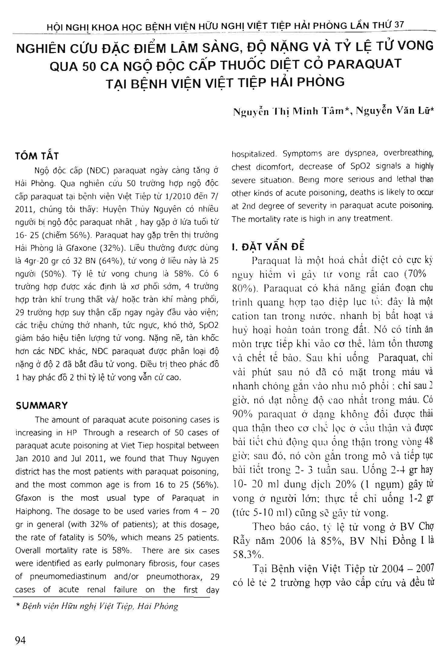 The amount of paraquat acute poisoning cases is increasing in Hai Phong. Through a research of 50 cases of paraquat acute poisoning at Viet Tiep hospital between Jan 2010 and Jul 2011, the authors found that Thuy Nguyen district has the most patients with paraquat poisoning, and the most common age is from 16 to 25 (56 percent). Gfaxon is the most usual type of Paraquat in Hai Phong. The dosage to be used varies from 4-20 gr in general (with 32 percent of patients); at this dosage, the rate of fatality is 50 percent, which means 25 patients. Overall mortality rate is 58 percent. There are six cases were identified as early pulmonary fibrosis, four cases of pneumomediastinum and/or pneumothorax, 29 cases of acute renal failure on the first day hospitalized. Symptoms are dyspnea, overbreathing, chest dicomfort, decrease of SpO2 signals a highly severe situation. Being more serious and lethal than other kinds ot acute poisoning, deaths is likely to occur at 2nd degree of severity in paraquat acute poisoning.The mortality rate is high in any treatment.