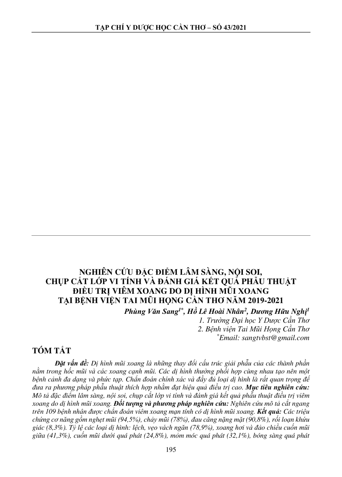 Dị hình mũi xoang là những thay đổi cấu trúc giải phẫu của các thành phần nằm trong hốc mũi và các xoang cạnh mũi. Các dị hình thường phối hợp cùng nhau tạo nên một bệnh cảnh đa dạng và phức tạp. Chẩn đoán chính xác và đầy đủ loại dị hình là rất quan trọng để đưa ra phương pháp phẫu thuật thích hợp nhằm đạt hiệu quả điều trị cao. Mục tiêu nghiên cứu: Mô tả đặc điểm lâm sàng, nội soi, chụp cắt lớp vi tính và đánh giá kết quả phẫu thuật điều trị viêm xoang do dị hình mũi xoang. Đối tượng và phương pháp nghiên cứu: Nghiên cứu mô tả cắt ngang trên 109 bệnh nhân được chẩn đoán viêm xoang mạn tính có dị hình mũi xoang. Kết quả: Các triệu chứng cơ năng gồm nghẹt mũi (94,5%), chảy mũi (78%), đau căng nặng mặt (90,8%), rối loạn khứu giác (8,3%). Tỷ lệ các loại dị hình: lệch, vẹo vách ngăn (78,9%), xoang hơi và đảo chiều cuốn mũi giữa (41,3%), cuốn mũi dưới quá phát (24,8%), mỏm móc quá phát (32,1%), bóng sàng quá phát (45,9%), tế bào đê mũi quá phát (25,7%), tế bào Haller quá phát (18,3%). Phối hợp ≥3 loại dị hình chiếm đa số với 56,9%. Viêm nhóm xoang hàm và sàng trước thường gặp nhất với 66,6% và 45,9%. Sau 3 tháng triệu chứng cơ năng và thực thể qua nội soi mũi cải thiện rõ rệt. Đánh giá sau phẫu thuật 3 tháng kết quả tốt đạt 85,3%, trung bình 11,9% và xấu 2,8%. Kết luận: Phẫu thuật nội soi điều trị viêm xoang do dị hình mũi xoang đạt hiệu quả điều trị cao