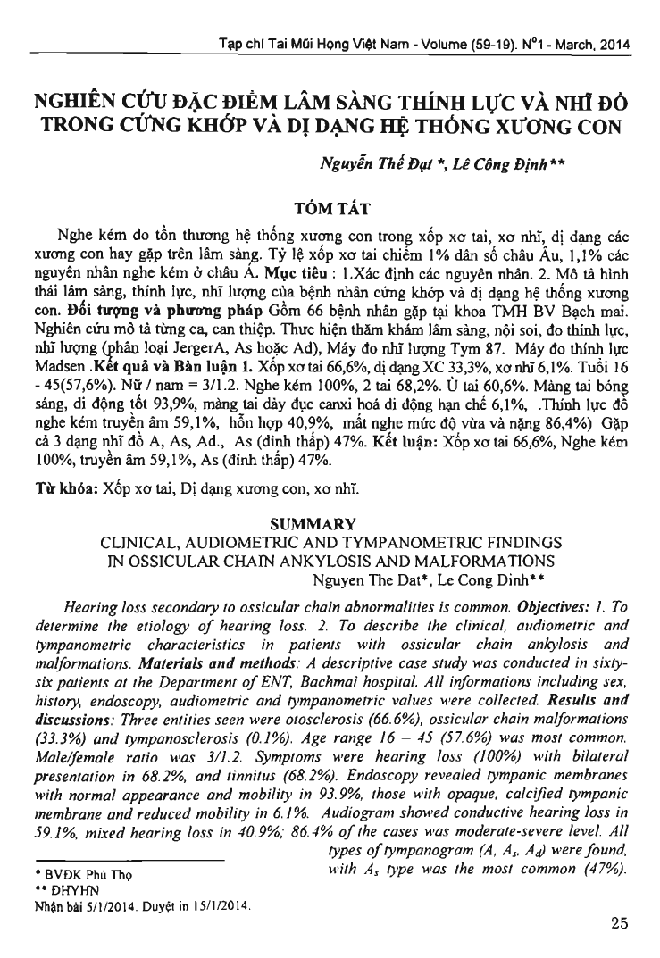 Hearing loss secondary to ossicular chain abnormalities is common. Objectives: 1. To determine the etiology of hearing loss. 2. To describe the clinical/ audiometric and tympanometric characteristics in patients with ossicular chain ankylosis and malformations. Materials and methods: A descriptive case study was conducted in sixtysix patients at the Department of ENT, Bachmai hospital. All informations including sex, history, endoscopy, audiometric and tympanometric values were collef!(ted. Results and discussions: Three entities seen were otosclerosis (66.6 percent), ossicular chain malformations (33.3 percent) and tympanosclerosis (0.1 percent). Age range 16 - 45 (57.6 percent) was most common. Malelfemale ratio was 3/1.2. Symptoms were hearing loss (100 percent) with bilateral presentation in 68.2 percent, and tinnitus (68.2 percent). Endoscopy revealed tympanic membranes with normal appearance and mobility in 93.9 percent, those with opaque, calcified tympanic membrane and reduced mobility in 6.1 percent. Audiogram showed conductive hearing loss in 59.1 percent, mixed hearing loss in 40.9 percent; 86.4 percent of the cases was moderate-severe level. All types of tympanogram (A, As, At) were found, with As type was the most common (47 percent). Conclusions: The etiology of hearing loss secondary to ossicular chain lesions were otosclerosis (66.6 percent), ossicular chain malformations (33.3 percent) and tympanosclerosis (0.1 percent). Conductive hearing loss and tympanogram type As were 59.1 percent and 47 percent, respectively.