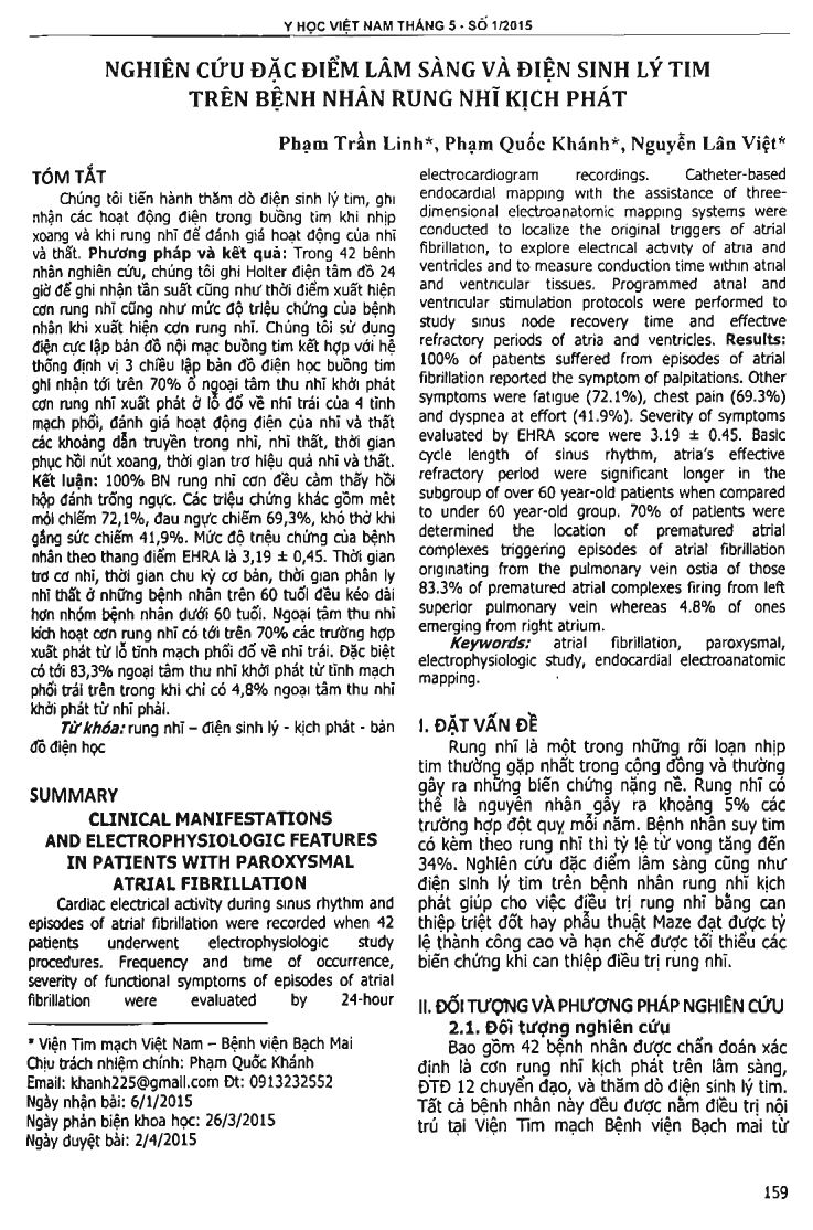 Cardiac electrical activity during sinus rhythm and episodes of atrial fibrillation were recorded when 42 patients underwent electrophysiologic study procedures. Frequency and time of occurrence, severity of functional symptoms of episodes of atrial fibrillation were evaluated by 24-hour electrocardiogram recordings. Catheter-based endocardial mapping with the assistance of threedimensional electroanatomic mapping systems were conducted to localize the original triggers of atrial fibrillation, to explore electrical activity of atria and ventricles and to measure conduction time within atrial and ventricular tissues. Programmed atrial and ventricular stimulation protocols were performed to study sinus node recovery time and effective refractory periods of atria and ventricles. Results: 100 percent of patients suffered from episodes of atrial fibrillation reported the symptom of palpitations. Other symptoms were fatigue (72.1 percent), chest pain (69.3 percent) and dyspnea at effort (41.9 percent). Severity of symptoms evaluated by EHRA score were 3.19 +/- 0.45. Basic cycle length of sinus rhythm, atria's effective refractory period were significant longer in the subgroup of over 60 year-old patients when compared to under 60 year-old group. 70 percent of patients were determined the location of prematured atrial complexes triggering episodes of atrial fibrillation originating from the pulmonary vein ostia of those 83.3 percent of prematured atrial complexes firing from left superior pulmonary vein whereas 4.8 percent of ones emerging from right atrium.
