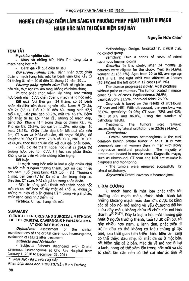 Objectives: Assessment of the clinical manifestations of the orbital cavernous heamangioma, evaluation of results after treatment. Subjects and Methods: - Subjects: Patients diagnosed with Orbital cavernous heamangioma at Cho Ray Hospital from January 1, 2010 to December 31, 2011. Methodology: Design: longitudinal, clinical trials, no control group. Sampling: Take a series of cases of orbital cavernous heamangioma. Results: In this study, after 24 months, 26 patients were eligible for the study. Men: 9 (34.6 percent ), women: 21 (65.4 percent ). Age: from 20 to 60, average age 42.9 + or - 8.1. The right orbit was affected in 14cases (53.9 percent )and the left orbit in 12 cases (46.1 percent ). The disease progresses slowly. Axial proptosis without pulse or murmur. The tumor located in muscle cone: 73.1 percent of cases. Papilloedema: 26.9 percent, apilloatrophy 11.5 percent, choroidal folds: 26.9 percent. Diagnosis is based on the results of ultrasound, CT scan and MRI. With ultrasound, the sensitivity was 56.0 percent, specificity: 91.0 percent ; CT scan: 78 percent and 93 percent, MRI: 91.0 percent and 86.0 percent, using the standard of pathology results. Treatment: The tumors were removed successfully by lateral orbitotomy in 22/26 (84.6 percent ). Conclusion: - Orbital cavernous heamangioma is the most common benign orbital tumor in adult. It is more commonly seen in women than in men with slowly progressive unilateral proptosis. The majority of tumors are located in muscle cone. Diagnostic imaging such as ultrasound, cr scan and MRI are valuable in diagnosis and monitoring. - The tumors were removed successfully by lateral orbitotomy.