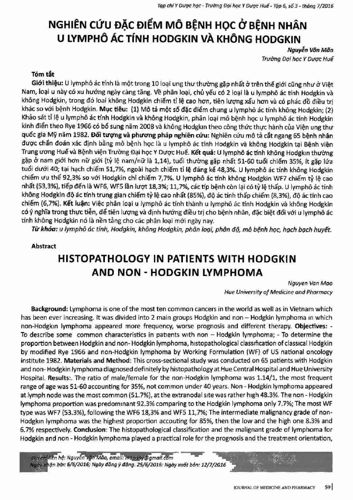 Nghiên cứu đặc điểm mô bệnh học trên 65 bệnh nhân u lympho ác tính Hodgkin và không Hodgkin tại bệnh viện Trung ương Huế và bệnh viện trường Đại học Y dược Huế. Kết quả cho thấy U lympho ác tính không Hodgkin thường gặp ở nam giới hơn nữ giới. U lympho ác tính không Hodgkin chiếm ưu thế với 92,3 phần trăm. U lympho ác tính không Hodgkin WF7 chiếm tỷ lệ cao nhất, tiếp đến là WF6 và WF5. U lympho ác tính không Hodgkin độ ác tính trung giam chiếm tỷ lệ cao nhất là 85 phần trăm, độ ác tính thấp chiếm 8,3 phần trăm và độ ác tính cao chiếm 6,7 phần trăm.