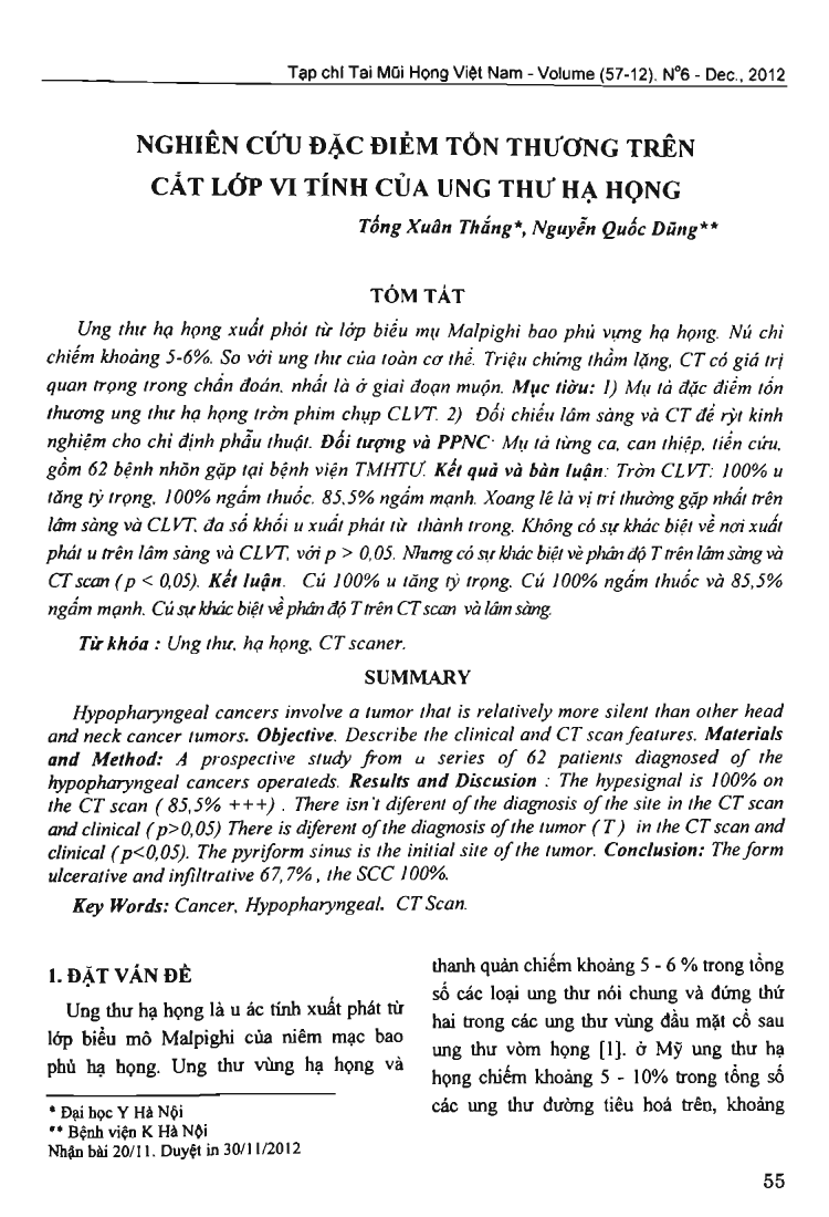 Nghiên cứu đặc điểm tổn thương trên cắt lớp vi tính của ung thư hạ họng
