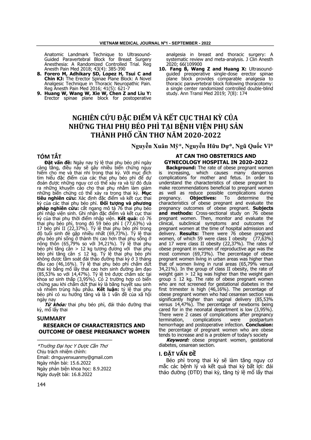 Ngày nay tỷ lệ thai phụ béo phì ngày càng tăng, điều này sẽ gây nhiều biến chứng nguy hiểm cho mẹ và thai nhi trong thai kỳ. Với mục đích tìm hiểu đặc điểm của các thai phụ béo phì để dự đoán được những nguy cơ có thể xảy ra và từ đó đưa ra những khuyến cáo cho thai phụ nhằm làm giảm những biến chứng có thể xảy ra trong thai kỳ. Mục tiêu nghiên cứu: Xác định đặc điểm và kết cục thai kỳ của các thai phụ béo phì. Đối tượng và phương pháp nghiên cứu: cắt ngang mô tả 76 thai phụ béo phì nhập viện sinh. Ghi nhận đặc điểm và kết cục thai kỳ của thai phụ thời điểm nhập viện. Kết quả: có 76 thai phụ béo phì, trong đó 59 béo phì I (77,63%) và 17 béo phì II (22,37%). Tỷ lệ thai phụ béo phì trong độ tuổi sinh đẻ gặp nhiều nhất (69,73%). Tỷ lệ thai phụ béo phì sống ở thành thị cao hơn thai phụ sống ở nông thôn (65,79% so với 34,21%). Tỷ lệ thai phụ béo phì tăng cân > 12 kg tương đương với thai phụ béo phì tăng cân ≤ 12 kg. Tỷ lệ thai phụ béo phì không được tầm soát đái tháo đường thai kỳ ở 3 tháng đầu cao (46,16%). Tỷ lệ thai phụ béo phì chấm dứt thai kỳ bằng mổ lấy thai cao hơn sinh đường âm đạo (85,53% so với 14,47%). Tỷ lệ trẻ được chăm sóc tại khoa sơ sinh thấp (3,95%). Có 2 trường hợp có biến chứng sau khi chấm dứt thai kỳ là băng huyết sau sinh và nhiễm trùng hậu phẫu. Kết luận: tỷ lệ thai phụ béo phì có xu hướng tăng và là 1 vấn đề của xã hội ngày nay.