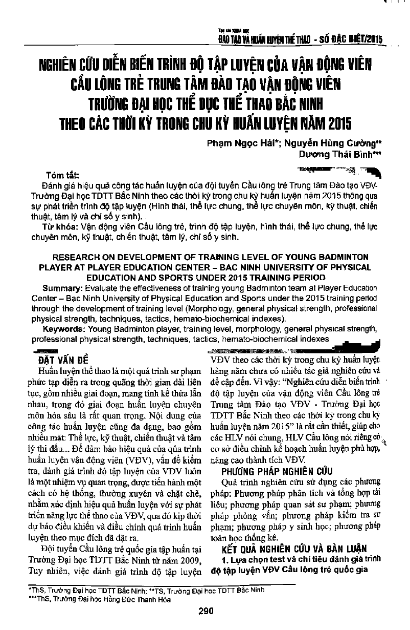Nghiên cứu diễn biến trình độ tập luyện của vận động viên cầu lông trẻ Trung tâm Đào tạo Vận động viên trường Đại học Thể dục thể thao Bắc Ninh theo các thời kỳ trong chu kỳ huấn luyện năm 2015
