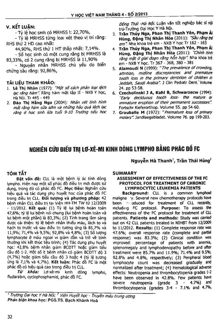Background: CLL is a common lymphoid malignancy. Several new chemotherapy protocols have been introduced for treatment of CLL recently, includlllg FC protocol. Purpose: To assess the effectiveness of the FC protocol for treatment of CLL patients. Patients and methods:. Study was carried out on 42 CLL patients treated in NIHBT from 12/2009 to 11/2012. Results: (1) Complete response rate was 47.6 percent; overall response rate (complete and partial response) was 83.3 percent; (2) Clinical condition was improved: percentage of patients with anemia, splenomegaly and Iymphodenopathy before and after treatment were 85.7 percent and 11.9 percent; 71.4 percent and 9.5 percent; 92.8 percent and 4.8 percent, respectively; (3) Peripheral blood lymphocyte count was decreased gradually and normalized after treatment; (4) Hematological adverse effects: Neutropenia and thrombocytopenia grades 1-2 have been observed in 42.8 percent. Few patients have severe neutropenia (grade 3 - 4.7 percent) and thrombocytopenia (grades 3-4 - 7.1 percent and 4.7 percent, respectively). Conclusion: FC is an effective chemotherapy protocol for treatment of CLL patients.