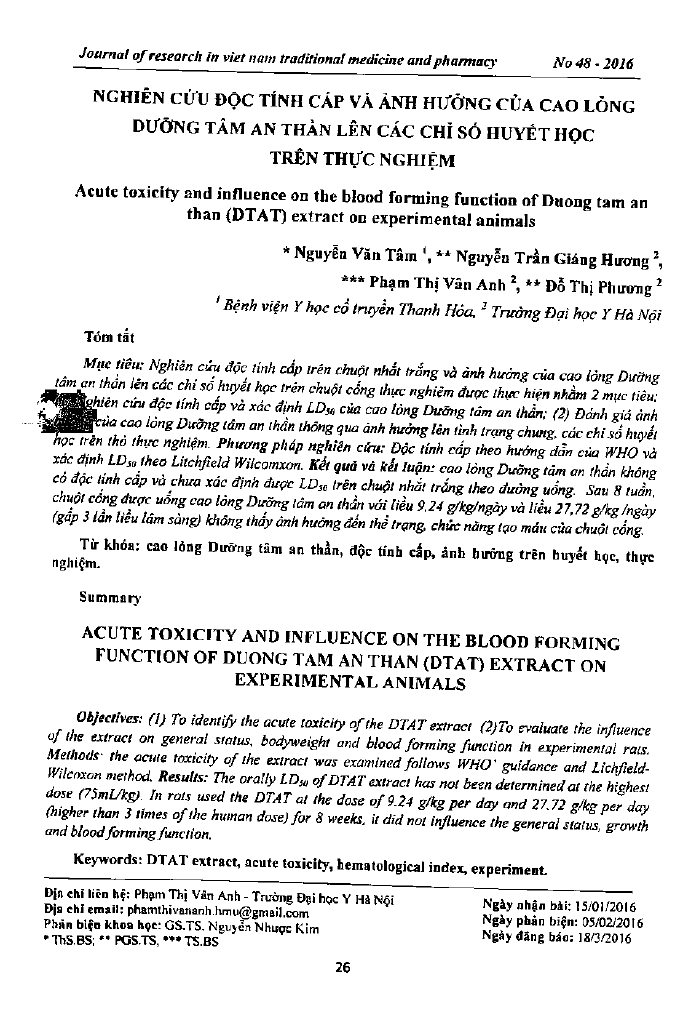 Nghiên cứu độc tính cấp và ảnh hưởng của cao lỏng dưỡng tâm an thần lên các chỉ số huyết học trên thực nghiệm
