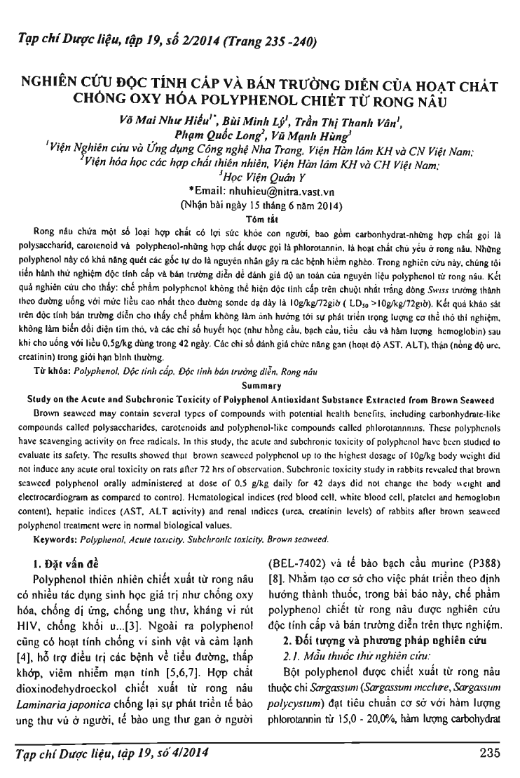 Nghiên cứu độc tính cấp và bán trường diễn của hoạt chất chống oxy hóa Polyphenol chiết từ rong nâu