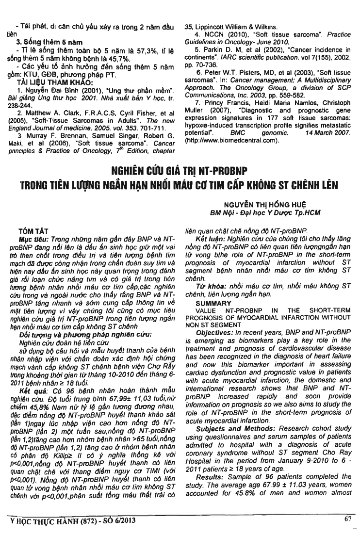 Objectives: In recent years, BNP and NT-proBNP is emerging as biomarkers play a key role in the treatment and prognosis of cardiovascular disease has been recognized in the diagnosis of heart failure and now this biomarker important in assessing cardiac dysfunction and prognostic value in patients with acute myocardial infarction, the domestic and intemational research shows: that BNP and NT-proBNP increased rapidly and soon provide information on prognosis so we also aims to study the role of NT-proBNP in the short-term prognosis of acute myocardial infarction. Subjects and Methods: Research cohort study using questionnaires and serum samples of patients admitted to hospital with a diagnosis of acute coronary syndrome without ST segment at Cho Ray Hospital in the period from January 9-2010 to 6 2011 patients or = 18 years of age. Results: Sample of 96 patients completed the study. The average age 67.99 + or - 11.03 years, women accounted for 45.8 percent of men and women almost equal rate, characteristics serum NT-proBNP concentrations survey (time 1) now enter higher levels of NT-proBNP (2) a week later, the concentration of NT-proBNP (1.2) higher than the group of patients 65 years of age, NT-proBNP concentrations (1.2) are found in the group of patients with Killip-grade or = II statistically significant with p 0.001, serum NTproBNP concentrations are closely related to the scale of TlMI risk (p 0.001). NT-proBNP serum concentrations related mortality patients with myocardial infarction without ST difference with p 0.001, left ventricular ejection fraction is closely related to the concentration of NT-proBNP. Conclusions: Our study showed increased levels of NT-proBNP concerning money short-terms of death myocardial infarction patients without ST segment and stable angina.