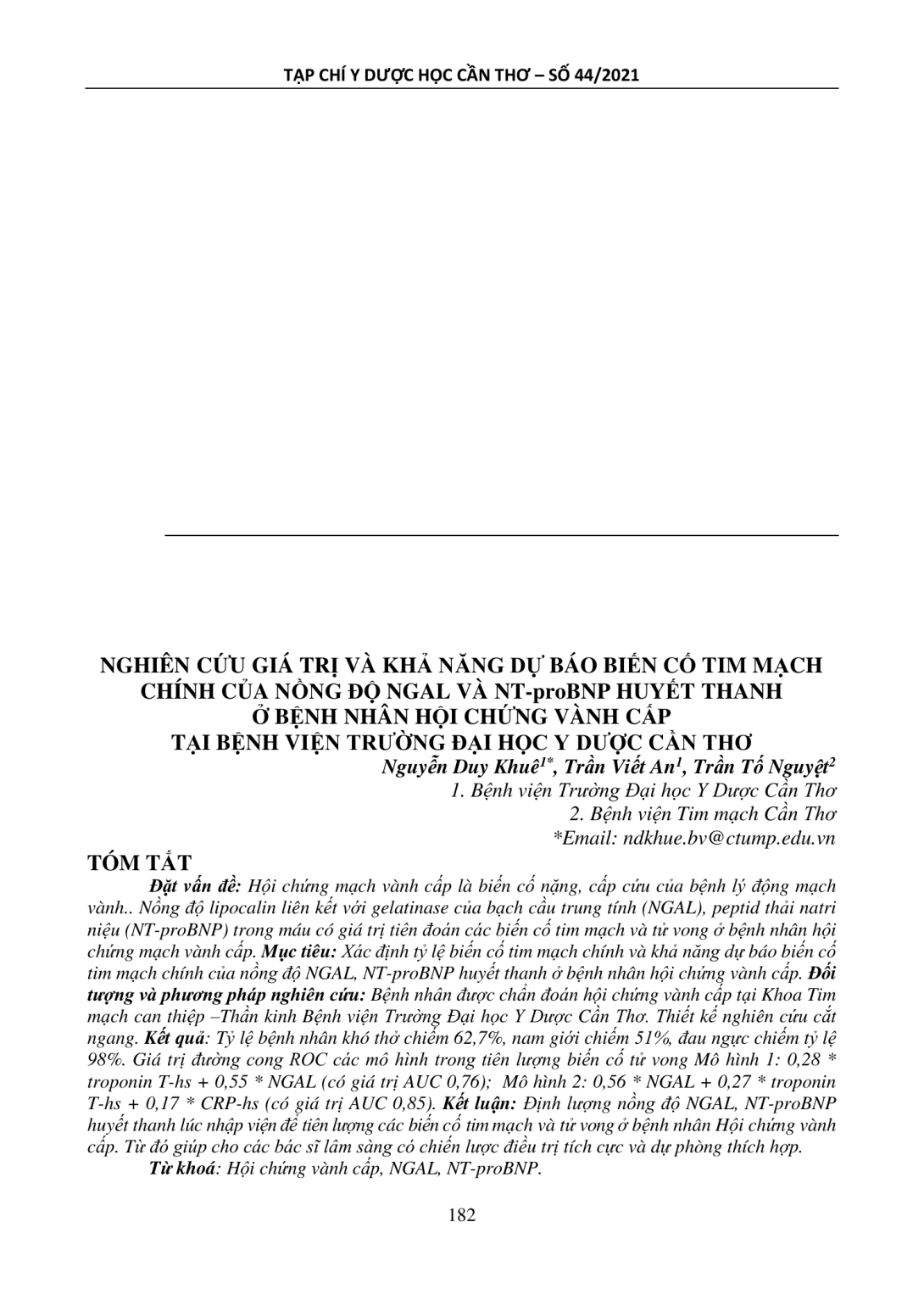 Hội chứng mạch vành cấp là biến cố nặng, cấp cứu của bệnh lý động mạch vành.. Nồng độ lipocalin liên kết với gelatinase của bạch cầu trung tính (NGAL), peptid thải natri niệu (NT-proBNP) trong máu có giá trị tiên đoán các biến cố tim mạch và tử vong ở bệnh nhân hội chứng mạch vành cấp. Mục tiêu: Xác định tỷ lệ biến cố tim mạch chính và khả năng dự báo biến cố tim mạch chính của nồng độ NGAL, NT-proBNP huyết thanh ở bệnh nhân hội chứng vành cấp. Đối tượng và phương pháp nghiên cứu: Bệnh nhân được chẩn đoán hội chứng vành cấp tại Khoa Tim mạch can thiệp –Thần kinh Bệnh viện Trường Đại học Y Dược Cần Thơ. Thiết kế nghiên cứu cắt ngang. Kết quả: Tỷ lệ bệnh nhân khó thở chiếm 62,7%, nam giới chiếm 51%, đau ngực chiếm tỷ lệ 98%. Giá trị đường cong ROC các mô hình trong tiên lượng biến cố tử vong Mô hình 1: 0,28 * troponin T-hs + 0,55 * NGAL (có giá trị AUC 0,76); Mô hình 2: 0,56 * NGAL + 0,27 * troponin T-hs + 0,17 * CRP-hs (có giá trị AUC 0,85). Kết luận: Định lượng nồng độ NGAL, NT-proBNP huyết thanh lúc nhập viện để tiên lượng các biến cố tim mạch và tử vong ở bệnh nhân Hội chứng vành cấp. Từ đó giúp cho các bác sĩ lâm sàng có chiến lược điều trị tích cực và dự phòng thích hợp.