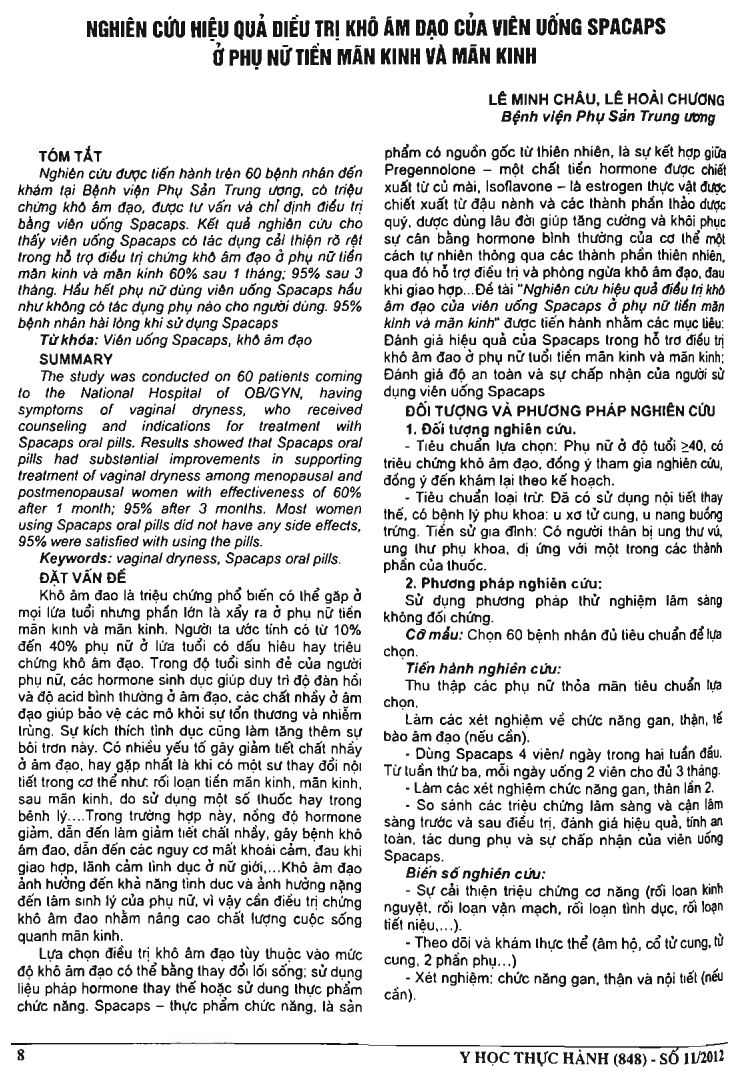 The study was conducted on 60 patients coming to the National Hospital of OBIGYN, having symptoms of vaginal dryness, who received counseling and indications for treatment with Spacaps oral pills. Results showed that Spacaps oral pills had substantial improvements in supporting treatment of vaginal dryness among menopausal and postmenopausal women with effectiveness of 60 percent after 1 month; 95 percent after 3 months. Most women using Spacaps oral pills did not have any side effects, 95 percent were satisfied with using the pills.