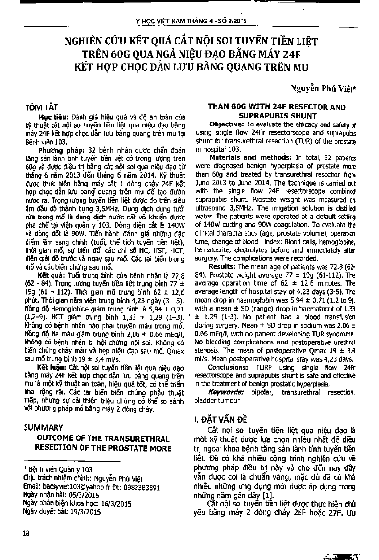 Nghiên cứu kết quả cắt nội soi tuyến tiền liệt trên 60g qua ngả niệu đạo bằng máy 24f kết hợp chọc dẫn lưu bàng quang trên mu