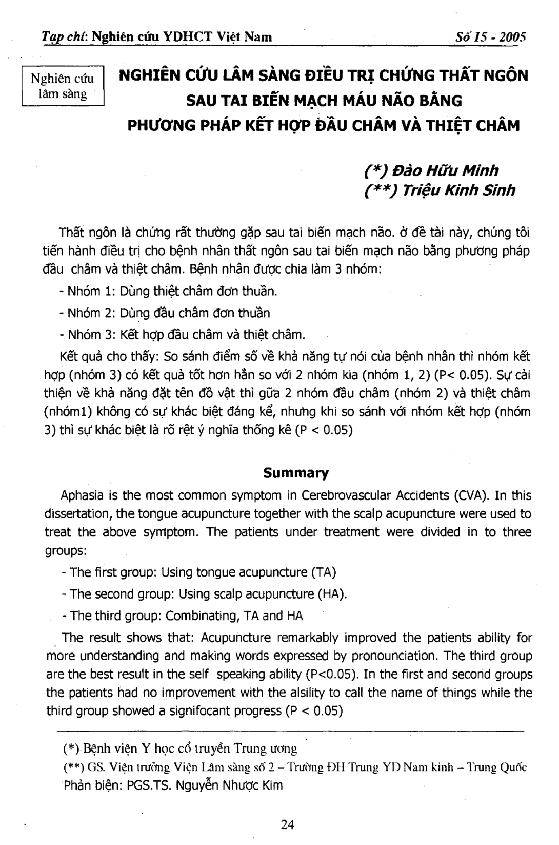 Thất ngôn là chứng thường gặp sau tai biến mạch máu não. Tiến hành điều trị cho bệnh nhân thất ngôn sau tai biến mạch máu não bằng phương pháp đầu châm và thiệt châm. Bệnh nhân được chia làm 3 nhóm: nhóm 1 dùng thiệt châm đơn thuần, nhóm 2 dùng đầu châm đơn thuần, nhóm 3 kết hợp đầu châm và thiệt châm. Kết quả cho thấy, điểm số về khả năng tự nói của bệnh nhân ở nhóm 3 tốt hơn hẳn so với nhóm 1 và nhóm 2. Sự cải thiện về khả năng đặt tên đồ vật giữa nhóm 1 và nhóm 2 không có sự khác biệt đáng kể, nhưng khi so sánh với nhóm 3 thì có sự khác biệt rõ rệt có ý nghĩa thống kê (p0,05).