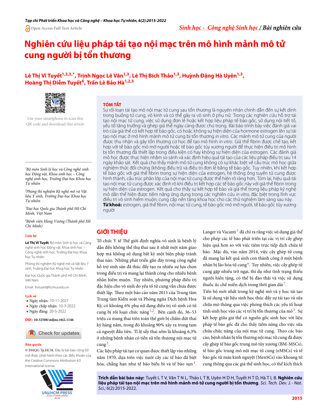 Sự rối loạn tái tạo mô nội mạc tử cung sau tổn thương là nguyên nhân chính dẫn đến sự kết dính trong buồng tử cung, vô kinh và có thể gây ra vô sinh ở phụ nữ. Trong các nghiên cứu hỗ trợ tái tạo nội mạc tử cung, việc sử dụng đơn lẻ hoặc kết hợp liệu pháp tế bào gốc, sử dụng nội tiết tố, yếu tố tăng trưởng và ghép giá thể ngày càng được chú trọng. Bài báo trình bày việc đánh giá vai trò của giá thể có kết hợp tế bào gốc, có hoặc không sự hiện diện của hormone estrogen lên sự tái tạo nội mạc ở mô hình mảnh mô tử cung bị tổn thương in vitro. Các mảnh mô tử cung của người được thu nhận và gây tổn thương cơ học để tạo mô hình in vitro. Giá thể fibrin được chế tạo, kết hợp với tế bào gốc mô mỡ người hoặc tế bào gốc tủy xương người để thực hiện điều trị mô hình bị tổn thương đã thiết lập trong điều kiện có hay không sự hiện diện của estrogen. Các đánh giá mô học được thực hiện nhằm so sánh và xác định hiệu quả tái tạo của các liệu pháp điều trị sau 14 ngày khảo sát. Kết quả cho thấy mảnh mô tử cung không có sự khác biệt về cấu trúc mô học giữa nghiệm thức đối chứng (không điều trị) và điều trị đơn lẻ bằng tế bào gốc. Tuy nhiên, khi kết hợp tế bào gốc với giá thể fibrin trong sự hiện diện của estrogen, hệ thống ống tuyến tử cung được hình thành, cấu trúc phân lớp của nội mạc tử cung được thể hiện rõ ràng hơn. Tóm lại, hiệu quả tái tạo nội mạc tử cung được xác định rõ khi điều trị kết hợp các tế bào gốc này với giá thể fibrin trong sự hiện diện của estrogen. Kết quả cho thấy sự kết hợp tế bào và giá thể trong liệu pháp kỹ nghệ mô dần thể hiện được tiềm năng ứng dụng trong các nghiên cứu in vitro, đặc biệt trong lĩnh vực điều trị vô sinh hiếm muộn; cung cấp nền tảng khoa học cho các thử nghiệm lâm sàng sau này.