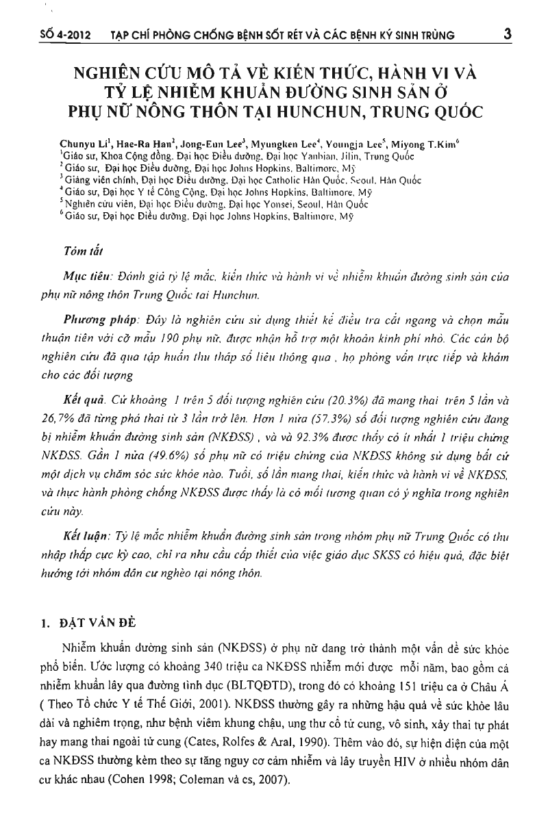 Nghiên cứu, mô tả về kiến thức, hành vi và tỷ lệ nhiễm khuẩn đường sinh sản ở phụ nữ nông thôn tại Hunchun, Trung Quốc