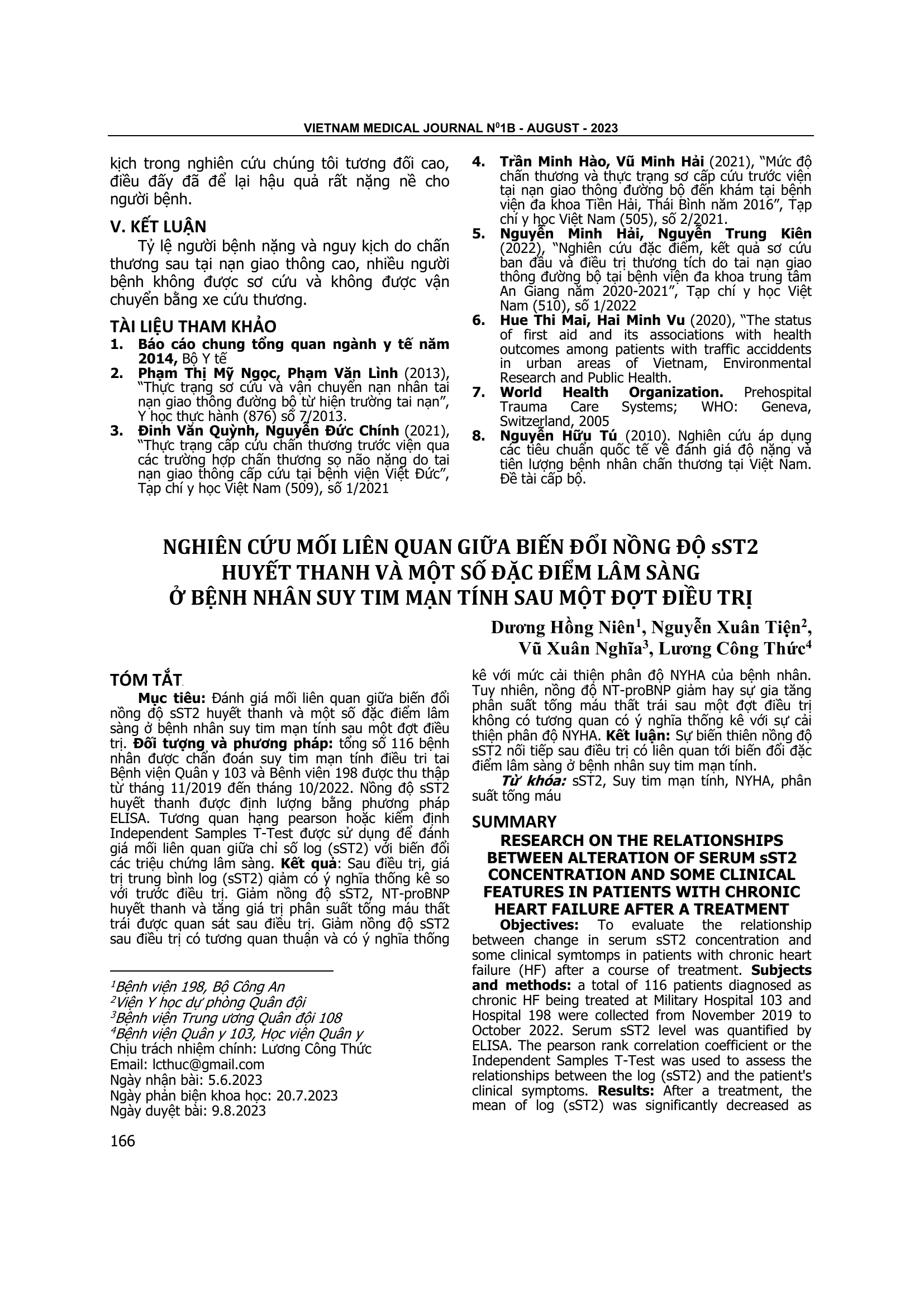 Đánh giá mối liên quan giữa biến đổi nồng độ sST2 huyết thanh và một số đặc điểm lâm sàng ở bệnh nhân suy tim mạn tính sau một đợt điều trị. Đối tượng và phương pháp: tổng số 116 bệnh nhân được chẩn đoán suy tim mạn tính điều trị tại Bệnh viện Quân y 103 và Bệnh viện 198 được thu thập từ tháng 11/2019 đến tháng 10/2022. Nồng độ sST2 huyết thanh được định lượng bằng phương pháp ELISA. Tương quan hạng pearson hoặc kiểm định Independent Samples T-Test được sử dụng để đánh giá mối liên quan giữa chỉ số log (sST2) với biến đổi các triệu chứng lâm sàng. Kết quả: Sau điều trị, giá trị trung bình log (sST2) giảm có ý nghĩa thống kê so với trước điều trị. Giảm nồng độ sST2, NT-proBNP huyết thanh và tăng giá trị phân suất tống máu thất trái được quan sát sau điều trị. Giảm nồng độ sST2 sau điều trị có tương quan thuận và có ý nghĩa thống kê với mức cải thiện phân độ NYHA của bệnh nhân. Tuy nhiên, nồng độ NT-proBNP giảm hay sự gia tăng phân suất tống máu thất trái sau một đợt điều trị không có tương quan có ý nghĩa thống kê với sự cải thiện phân độ NYHA. Kết luận: Sự biến thiên nồng độ sST2 nối tiếp sau điều trị có liên quan tới biến đổi đặc điểm lâm sàng ở bệnh nhân suy tim mạn tính.