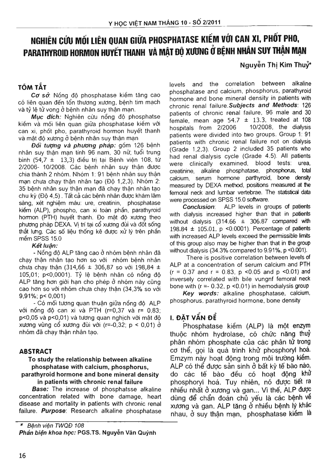 Base: The increase of phosphatsse alkaline concentration related with bone damage, heart disease and mortality in patients with chronic renal failure. Purpose: Research alkaline phosphatase levels and the correlation between alkaline phosphatase and calcium, phosphorus, parathyroid hormone and bone mineral density in patients with chronic renal failure. Subjects and Methods: 126 patients. of chronic renal failure, 96 male and 30 female, mean age 54.7 + or - 13.3, treated at 108 hospitals from 2/2006 - 10/2008, the dialysis patients were divided into two groups. Group 1: 91 patients with chronic renal failure not on dialysis (Grade 1,2,3). Group 2 included 35 patients who had renal dialysis cycle (Grade 4.5). All patients were clinically examined, blood tests: urea, creatinine, alkaline phosphatase, phosphorus, total calcium, serum hormone parthyroid, bone density measured by DEXA method, positions measured at the femoral neck and lumbar vertebrae. The statistical data were processed on SPSS 15.0 software. Conclusion: - ALP levels in groups of patients with dialysis increased higher than that in patients without dialysis (314.66 + or - 306.87 compared with 198.84 + or - 105.01, P 0.0001). Percentage of patients with increased ALP levels exceed the permissible limits of this group also may be higher than that in the group without dialysis (34.3 percent compared to 9.91 percent, p 0.001).- There is positive correlation between levels of ALP at a concentration of serum calcium and PTH (r