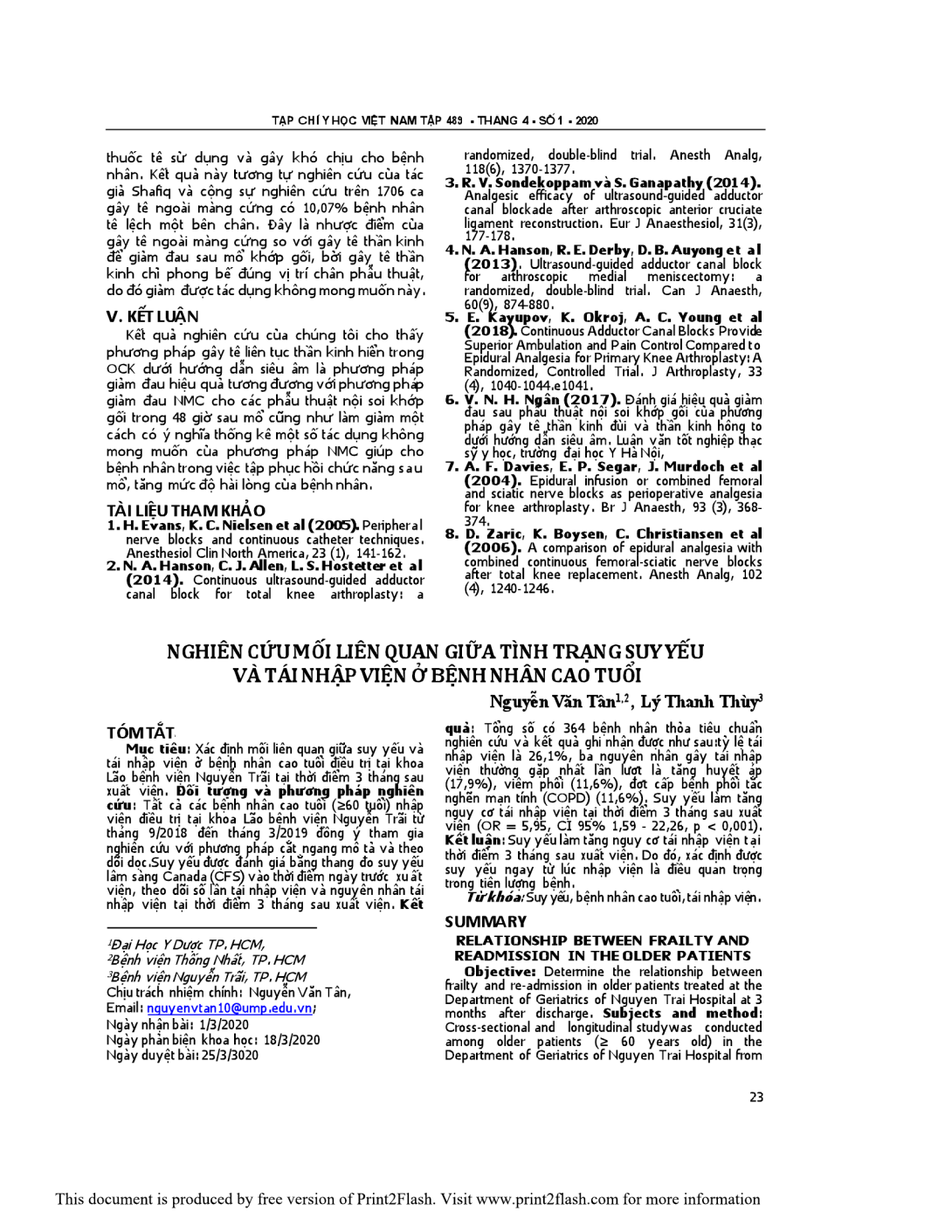 Xác định mối liên quan giữa suy yếu và tái nhập viện ở bệnh nhân cao tuổi điều trị tại khoa Lão bệnh viện Nguyễn Trãi tại thời điểm 3 tháng sau xuất viện. kết quả cho thấy Tất cả các bệnh nhân cao tuổi (≥60 tuổi) nhập viện điều trị tại khoa Lão bệnh viện Nguyễn Trãi từ tháng 9/2018 đến tháng 3/2019 đồng ý tham gia nghiên cứu với phương pháp cắt ngang mô tả và theo dõi dọc.Suy yếu được đánh giá bằng thang đo suy yếu lâm sàng Canada (CFS) vào thời điểm ngày trước xuất viện, theo dõi số lần tái nhập viện và nguyên nhân tái nhập viện tại thời điểm 3 tháng sau xuất viện. Suy yếu làm tăng nguy cơ tái nhập viện tại thời điểm 3 tháng sau xuất viện. Do đó, xác định được suy yếu ngay từ lúc nhập viện là điều quan trọng trong tiên lượng bệnh.