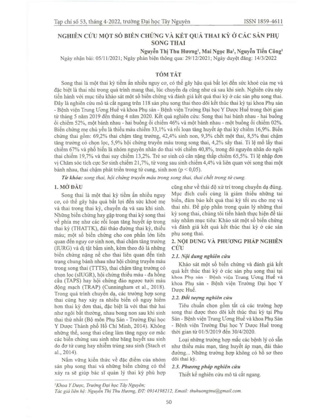 Song thai là một thai kỳ tiềm ẩn nhiều nguy cơ, có thể gây hậu quả bất lợi đến sức khoẻ của mẹ và đặc biệt là thai nhi trong quá trình mang thai, lúc chuyển dạ cũng như cả sau khi sinh. Nghiên cứu này tiến hành với mục tiêu khảo sát một số biến chứng và đánh giá kết quả thai kỳ ở các sản phụ song thai. Đây là nghiên cứu mô tả cắt ngang trên 118 sản phụ song thai theo dõi kết thúc thai kỳ tại khoa Phụ sản - Bệnh viện Trung Ương Huế và khoa Phụ sản - Bệnh viện Trường Đại học Y Dược Huế trong thời gian từ tháng 5 năm 2019 đến tháng 4 năm 2020. Kết quả nghiên cứu: Song thai hai bánh nhau - hai buồng ối chiếm 52%, một bánh nhau - hai buồng ối chiếm 46% và một bánh nhau - một buồng ối chiếm 02%. Biến chứng mẹ chủ yếu là thiếu máu chiếm 33,1% và rối loạn tăng huyết áp thai kỳ chiếm 16,9%. Biến chứng thai gồm: 69,2% thai chậm tăng trưởng, 42,4% sinh non, 9,3% chết một thai, 8,5% thai chậm tăng trưởng có chọn lọc, 5,9% hội chứng truyền máu trong song thai, 4,2% sẩy thai. Tỉ lệ mổ lấy thai chiếm 67% và phổ biến là nhóm nguyên nhân do thai với chiếm 40,8%, trong đó nguyên nhân do ngôi thai chiếm 19,7% và thai suy chiếm 13,2%. Trẻ sơ sinh có cân nặng thấp chiếm 65,5%. Tỉ lệ nhập đơn vị Chăm sóc tích cực Sơ sinh chiếm 21,7%, tử vong sau sinh chiếm 4,4% và liên quan với song thai một bánh nhau, thai chậm phát triển trong tử cung, sinh non (p < 0,05).